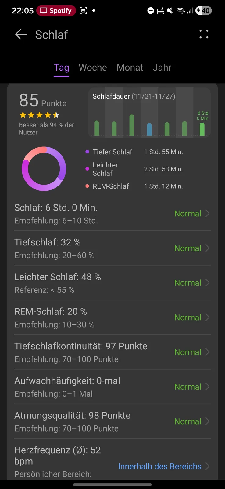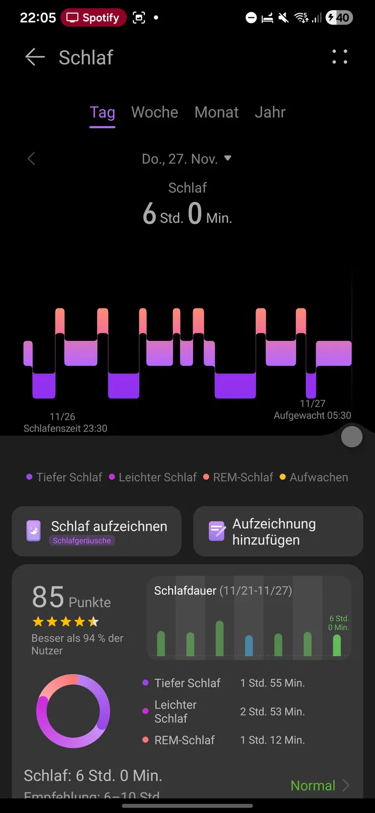 De Huawei Watch Ultimate 2 biedt uitgebreide slaaptracking. Het registreert de verschillende slaapfases en toont zowel hun timing als hun aandeel in de totale slaap. Deze stadia worden gevisualiseerd op een tijdlijn.