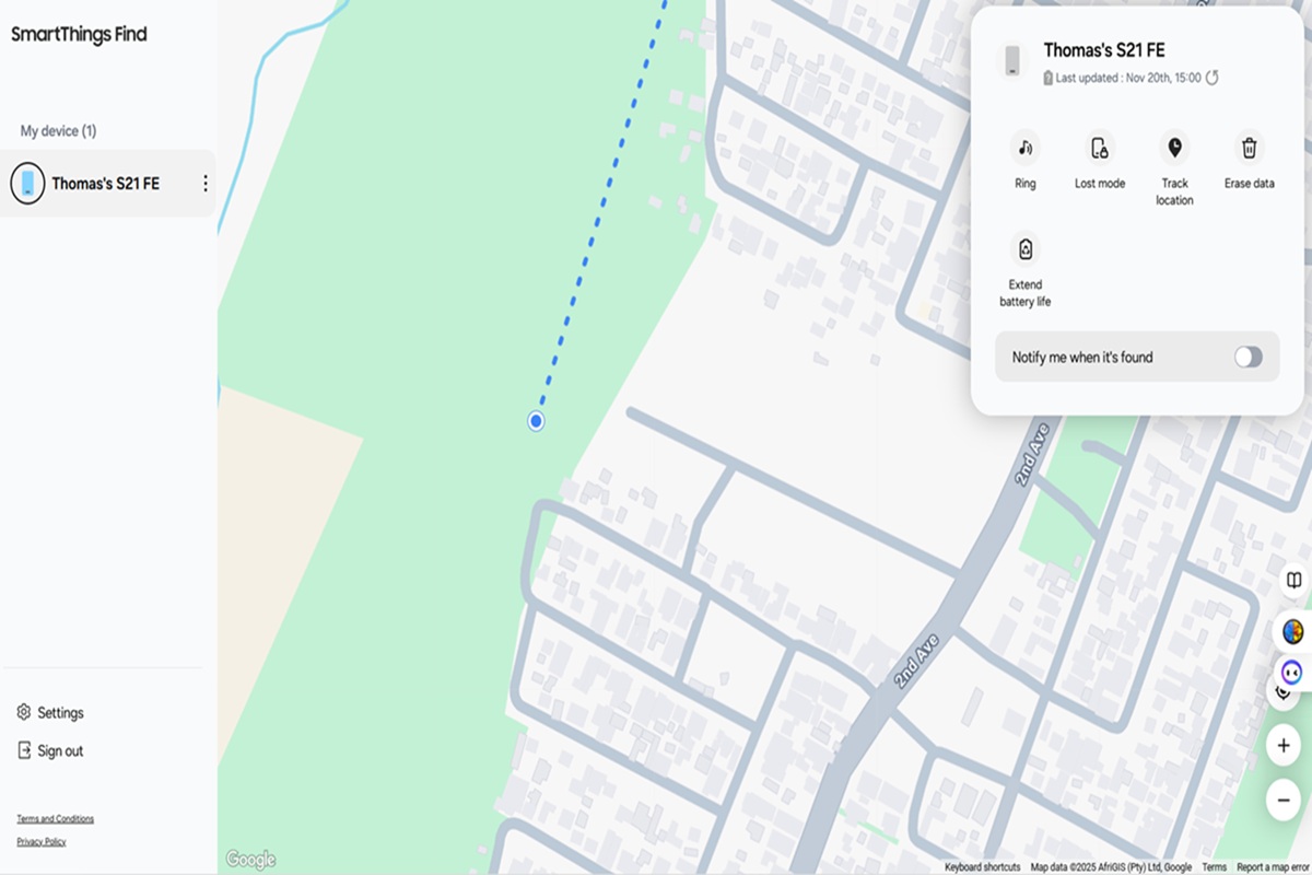 Google Find Hub bevestigde dat de telefoon nog actief was. Dit systeem vernieuwt locatiegegevens telkens wanneer de handset verbinding maakt met mobiele data of Wi-Fi. Het kan ook een brede laatst bekende locatie geven als de locatiegeschiedenis van tevoren was ingeschakeld, maar nauwkeurige, real-time tracering is afhankelijk van actief internet of GPS.