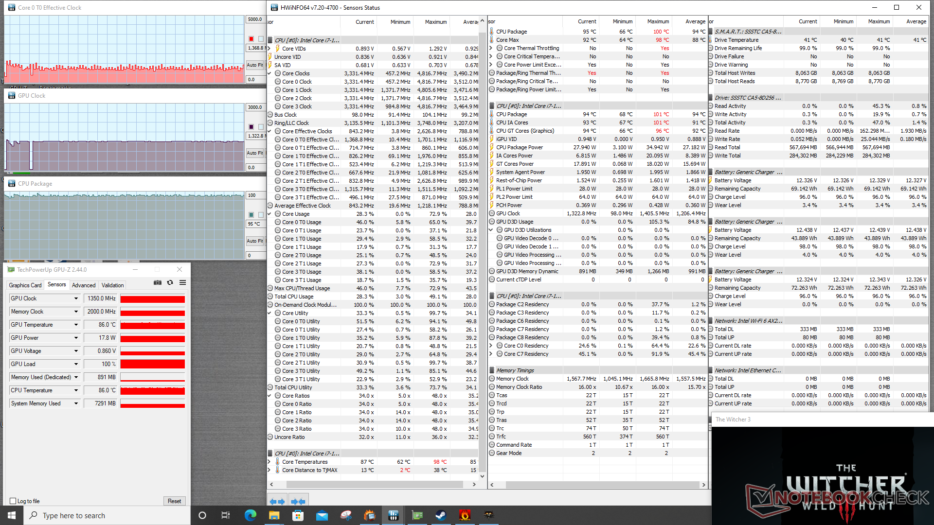 Tijdens het uitvoeren van Prime95, steeg de CPU kloksnelheid naar 2.9 GHz voor een zeer korte periode, voordat hij snel daalde en stabiliseerde op 2.4 GHz. Het vermogen van het CPU pakket liep op tot 41 W tijdens het begin van de test voordat het stabiliseerde op 26 W. De hoge kerntemperatuur van 95 C suggereert dat de CPU zo snel gaat als hij kan binnen de grenzen van het chassis wanneer hij wordt blootgesteld aan veeleisende verwerkingsbelastingen. Ter vergelijking, de CPU's in de S410 Gen 1 en Dell Latitude 7330 Rugged zouden stabiliseren op een lagere 80 C en 62 C, respectievelijk, wanneer ze werden onderworpen aan dezelfde omstandigheden.