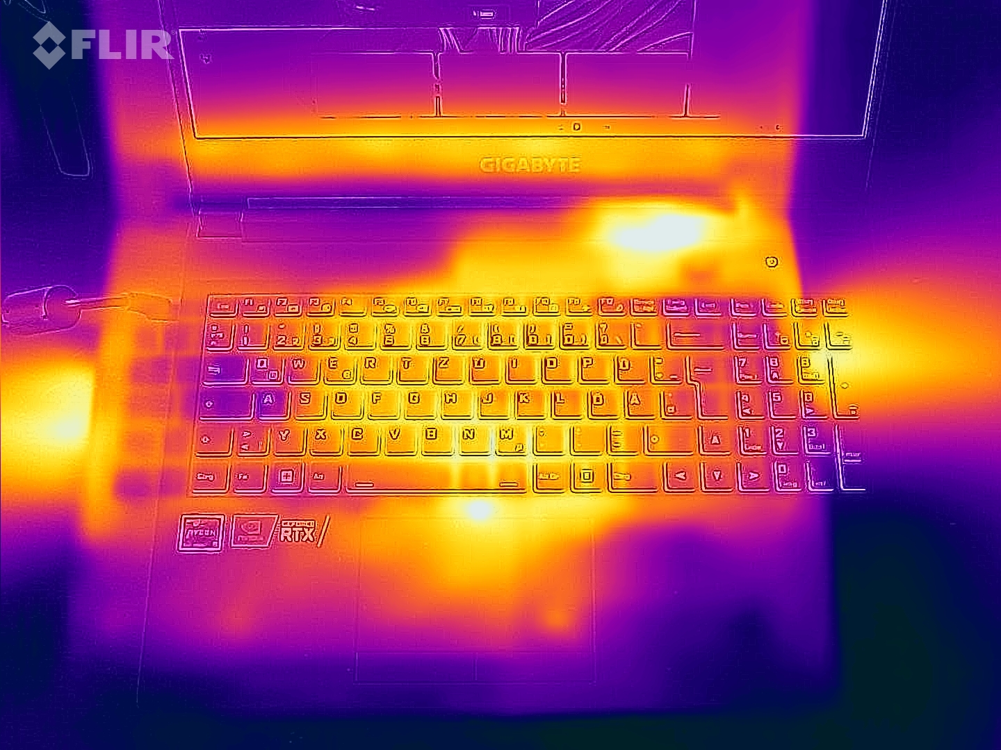 De temperatuurontwikkeling van de A5 K1 is ook niet briljant - ondanks de royale hoogte. Een maximum van 50 °C (122 °F) aan de bovenzijde en 51 °C (123,8 °F) aan de onderzijde na 60 minuten volledige belasting zijn meer dan veel dunnere laptops met vergelijkbare uitrusting.