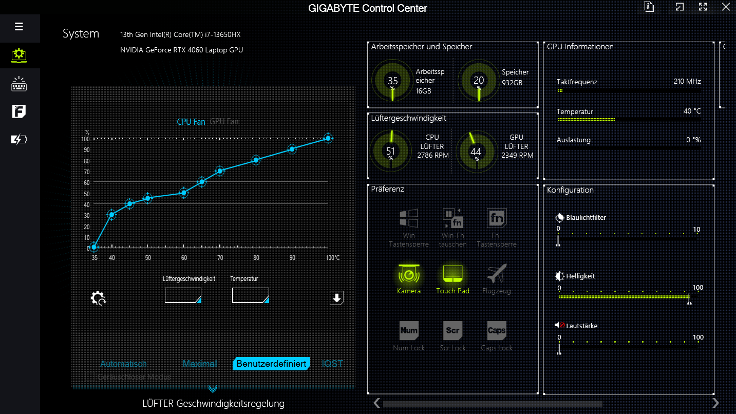 Dit gaat echter merkbaar ten koste van de prestaties, omdat de dGPU op deze manier niet werkt. Over het algemeen wordt de modus Entertainment aanbevolen voor dagelijks gebruik. Boven volle belasting blijft de geluidsontwikkeling op een gematigd niveau.
