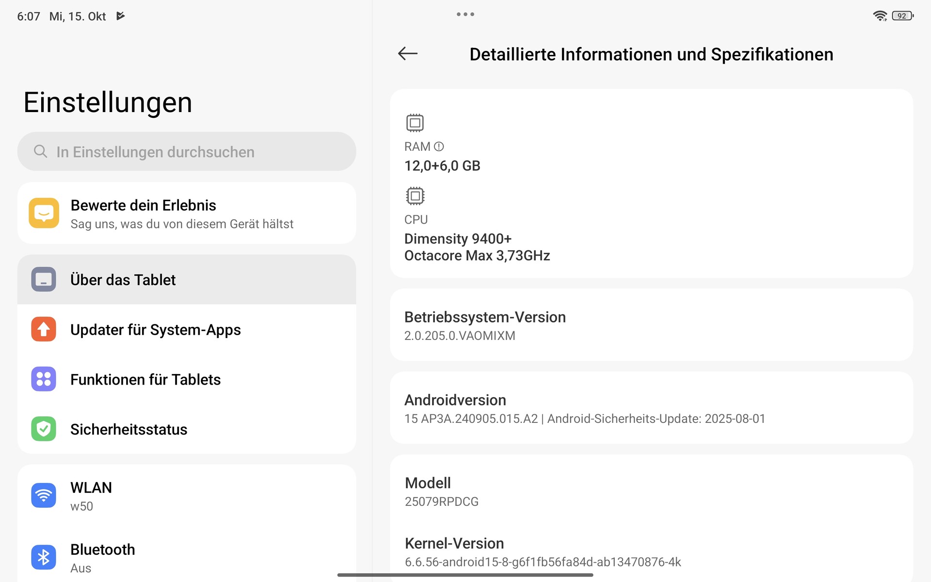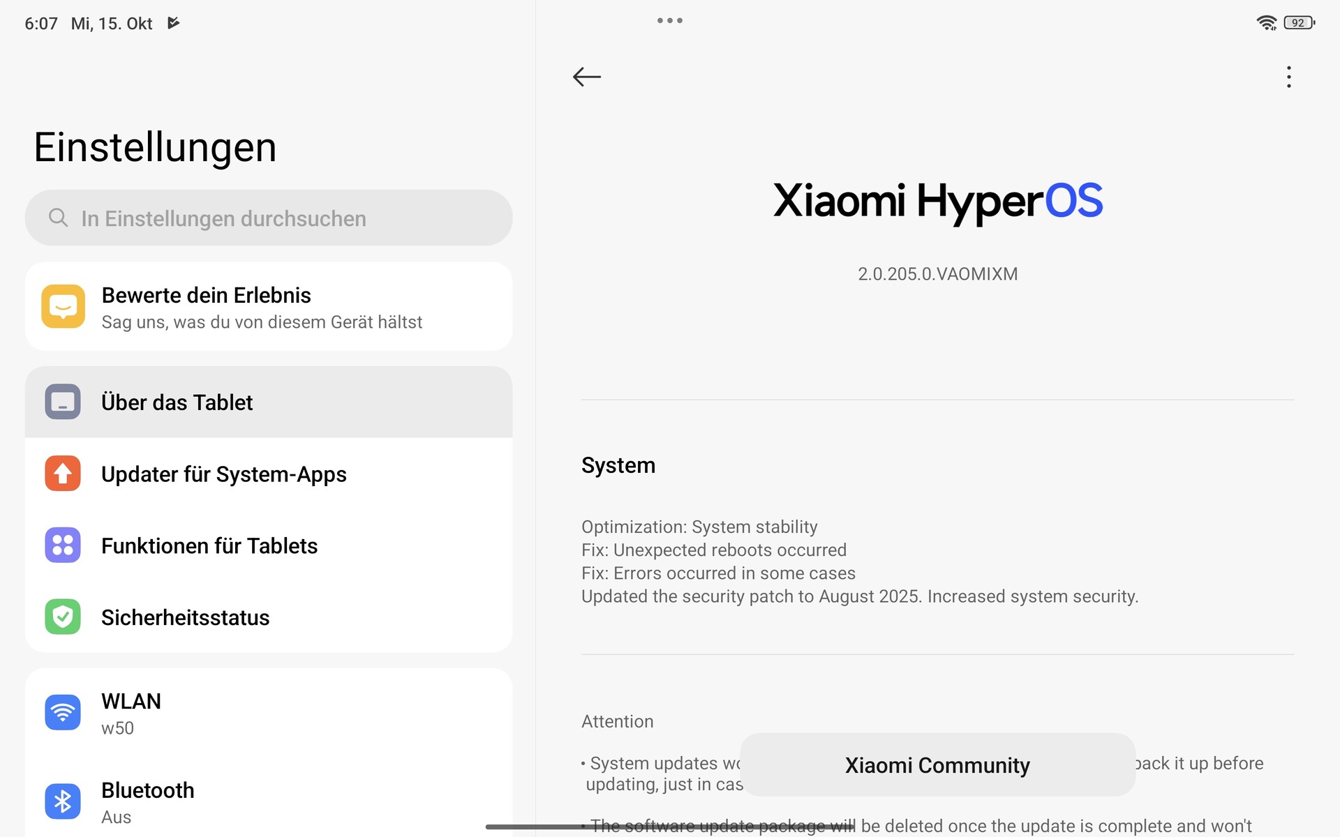 De Xiaomi Pad Mini draait op Android 15 met Xiaomi's HyperOS 2.0 gebruikersinterface. Volgens Xiaomi Trust Centerkrijgt de Pad Mini OS-upgrades tot Android 17. Hij zal ook 3 jaar lang, tot september 2028, voorzien worden van beveiligingsupdates. Deze laatste worden elke 3 maanden uitgebracht. Op het moment van testen, half oktober, draaide de tablet de Android beveiligingspatches van augustus, die dus up-to-date zijn.