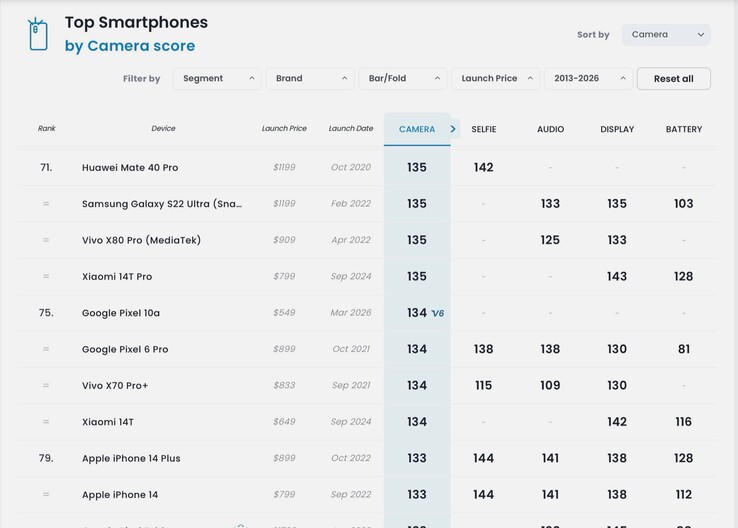 Het is dan ook niet verwonderlijk dat de Pixel 10a slechts 134 punten heeft behaald in de camera-analyse van DxOMark camera-analyse - zes punten meer dan de Pixel 9a, wat kan worden toegeschreven aan verbeteringen in de beeldverwerking. Dit is net genoeg voor de 75e plaats op de DxOMark cameragrafieken. Met 136 punten presteert zelfs de Pixel 8a beter, omdat Google twee jaar geleden een 64 MP hoofdcamera installeerde met een grotere 1/1,73 inch sensor. De veel oudere Apple iPhone 15 ligt ver voor op de Pixel 10a met 145 punten