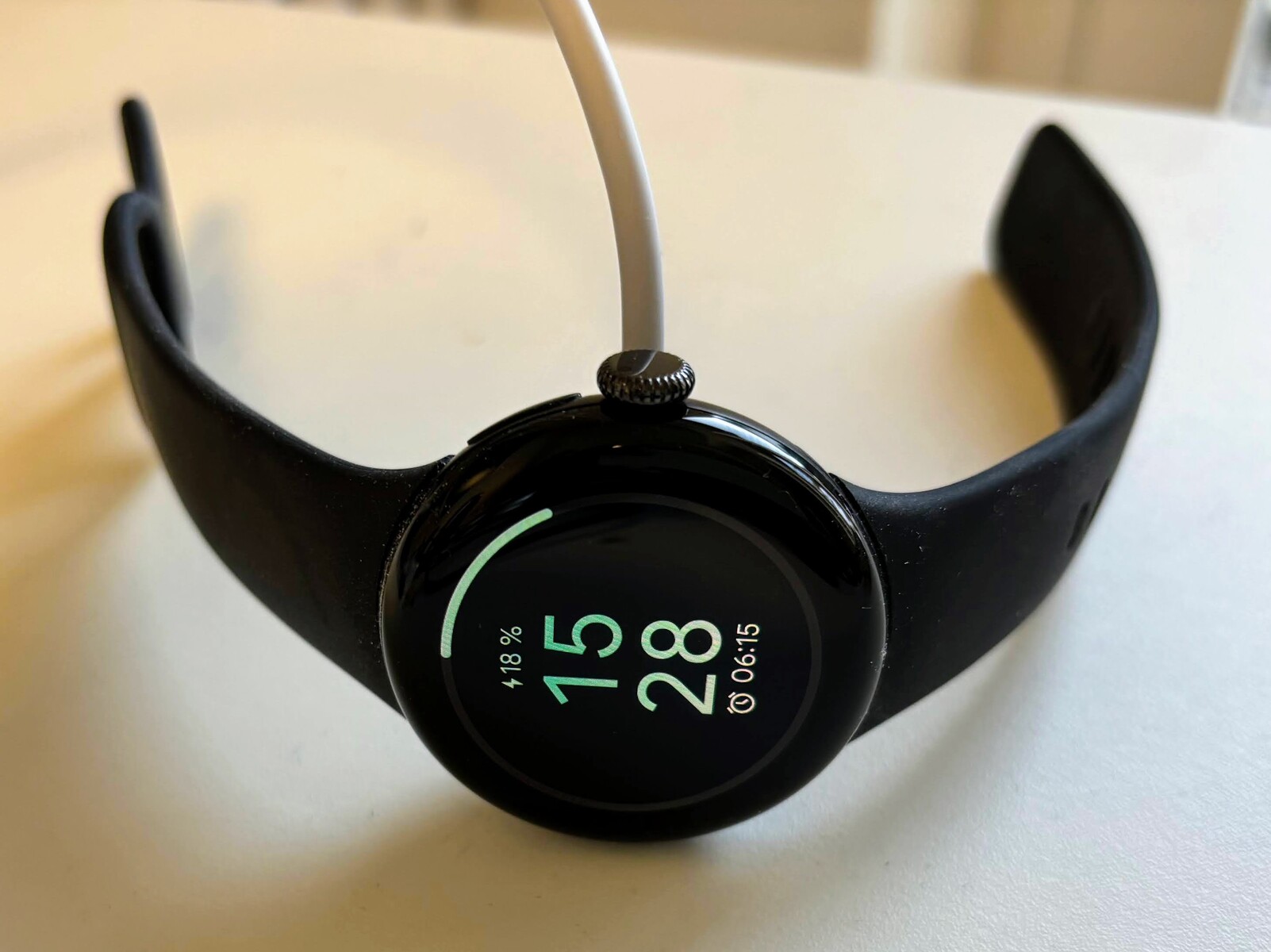 Het duurt 60 minuten om de 306 mAh batterij op te laden met een 18-watt Google lader. Na 15 minuten is de smartwatch opgeladen van nul tot eenentwintig procent. Tijdens het opladen toont de Pixel Watch de tijd en de wekker, maar de locatie wordt niet automatisch herkend en het display draait niet.