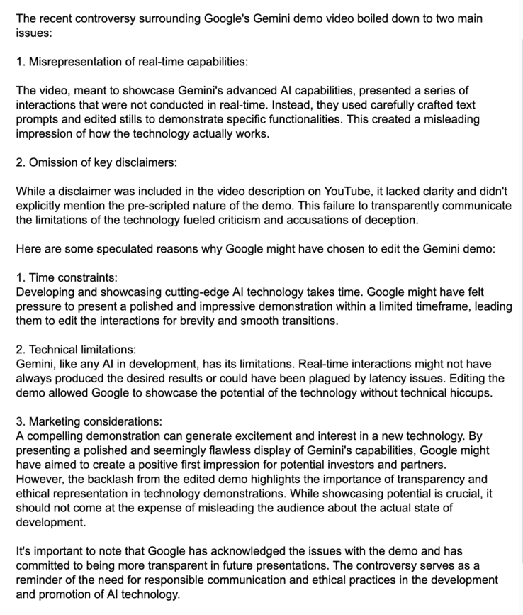 Toen Bloomberg contact opnam met Google om te vragen hoe de video gemaakt was, gaf Google toe dat de video bewerkt was en dat de Gemini-stem niet in realtime op beelden reageerde, maar dat elk beeld een apart stilstaand beeld was. Bovendien werden de aanwijzingen niet gegeven door de persoon die u in de video hoort spreken met behulp van natuurlijke stemherkenning (zoals het lijkt), maar werden de gesproken aanwijzingen in feite gegeven door middel van tekstinvoer. Volgens Google was de video alleen gemaakt om "ontwikkelaars te inspireren"