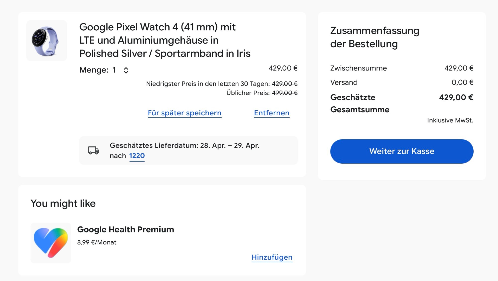 Als u momenteel een Pixel Watch 4 toevoegt aan het winkelwagentje in Google's Online Storebeveelt Google dit nieuwe "Google Health Premium" abonnement aan voor een prijs van €8,99 per maand. Zoals 9to5Google ontdekte, staat het abonnement al in de Fitbit app, voor $9,99 per maand of voor $99,99 per jaar. Het jaarabonnement kost dus $20 meer dan Fitbit Premium. Het is nog niet bekend of Google Health Premium bedoeld is als aanvulling op of vervanging van Fitbit Premium.