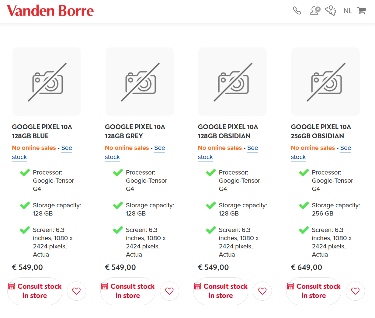 Niet alleen dat, maar Vanden Borre heeft ook de lanceringsprijzen onthuld. Op dit moment verwacht de verkoper de Pixel 10a te verkopen in de kleuren Blauw, Grijs en Obsidiaan. Zoals de screenshot hieronder laat zien, heeft Vanden Borre deze kleuren geprijsd voor €549 (~$650) met 128 GB opslagruimte. De verkoper bevestigt dat Google €649 (~$769) zal vragen voor 256 GB opslagruimte. De Pixel 10a zou echter verkrijgbaar moeten zijn met 256 GB opslagruimte in meer dan de Obsidian-afwerking die hieronder wordt getoond.