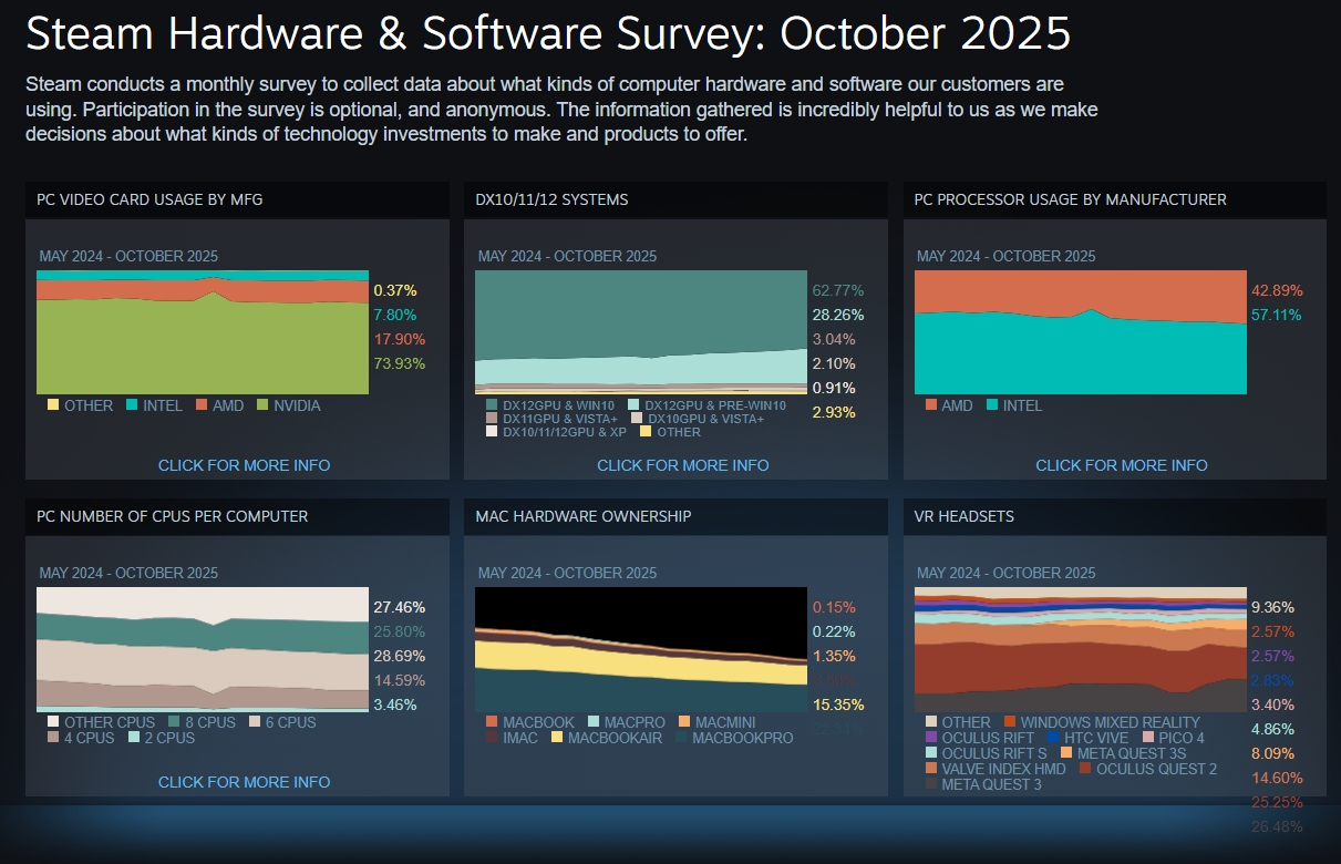 Linux-gaming heeft een nieuwe mijlpaal bereikt op Steam. Op basis van Valve's vrijwillige Steam Hardware and Software Survey voor oktober 2025zijn Linux en SteamOS nu samen goed voor iets meer dan drie procent van alle Steam-gebruikers die hebben gereageerd van alle responderende Steam-gebruikers, het hoogste cijfer ooit.