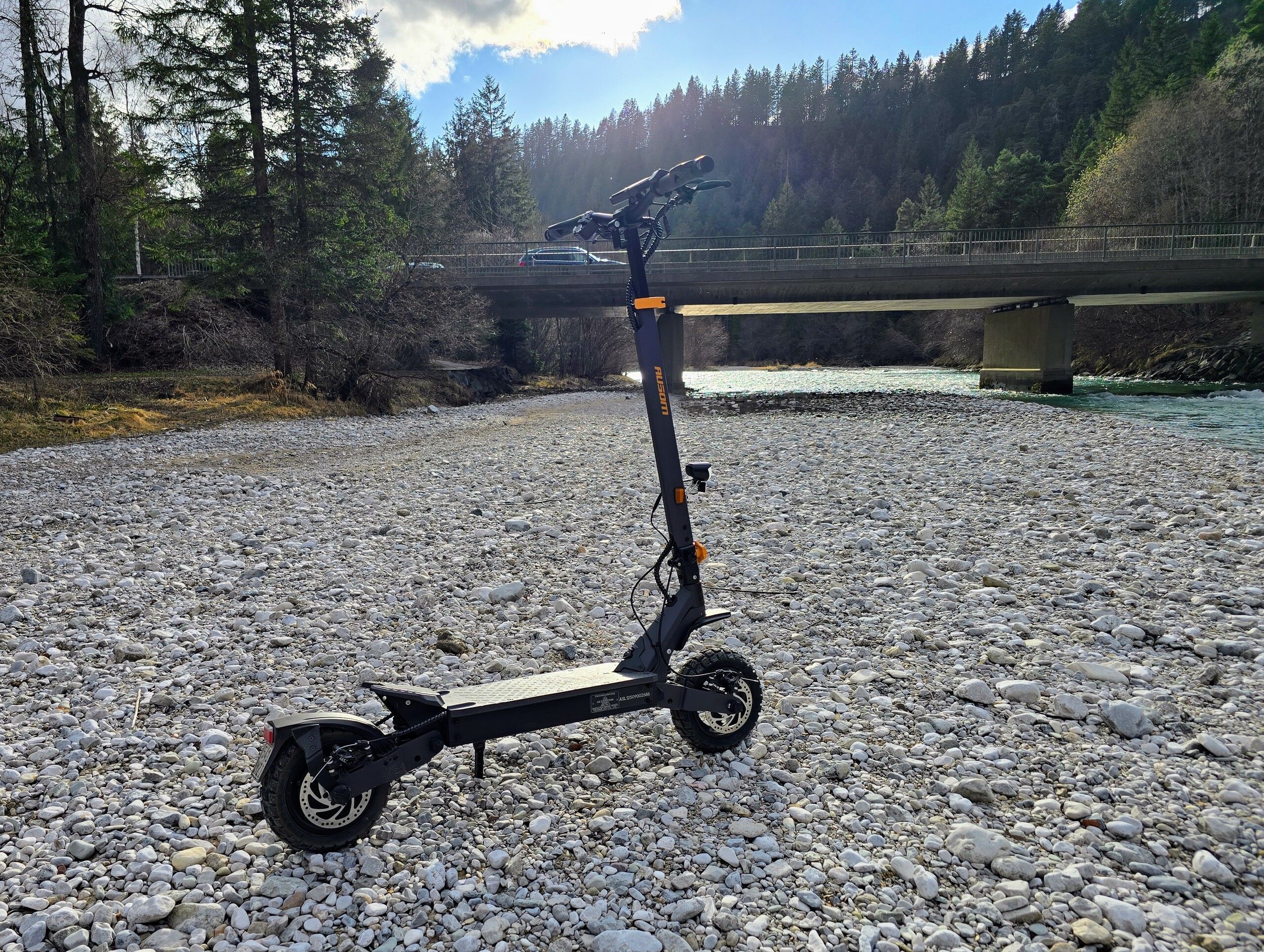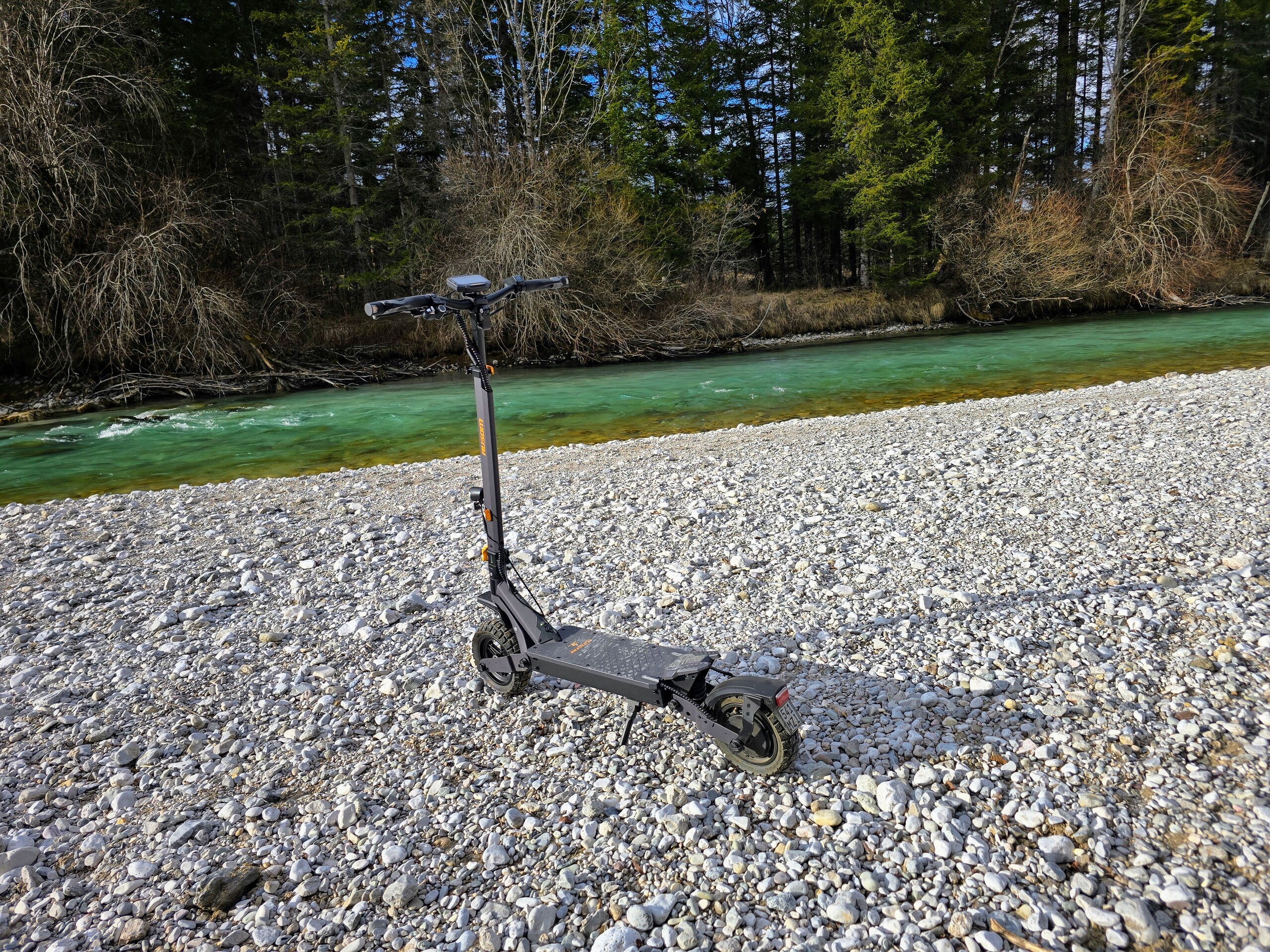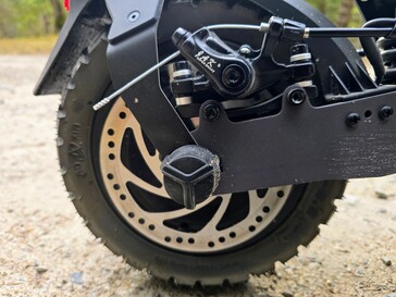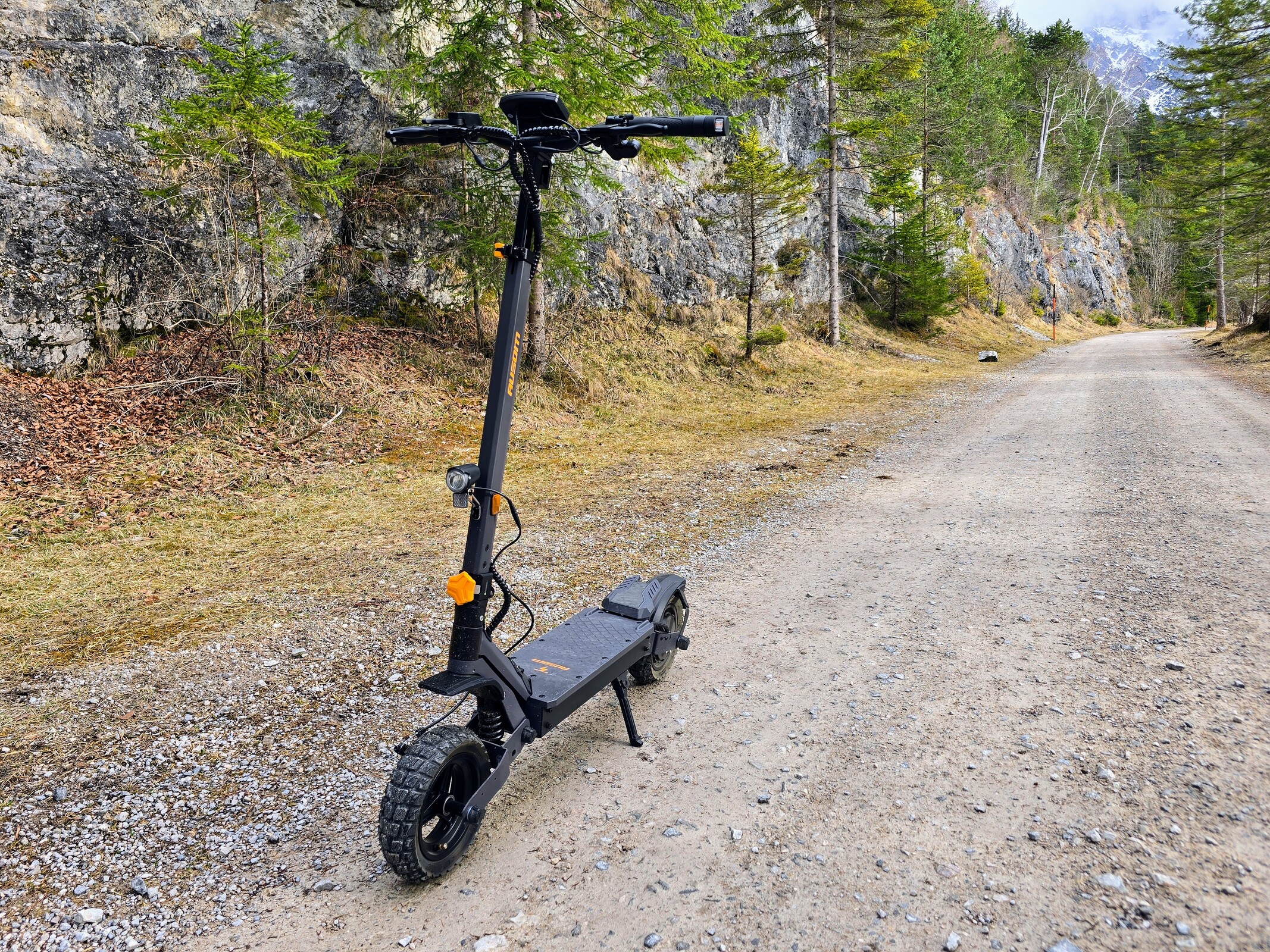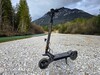 De vering is echter niet bijzonder gevoelig. Ruwe hobbels worden weggefilterd, maar de e-scooter rijdt droog over korte hobbels zoals kasseien. De grove banden zijn overtuigend. Hoewel ze een nogal hard afrolgeluid maken, zijn de gripreserves verrassend goed op zowel asfalt als onverharde wegen. Zelfs op nat wegdek kan de L1 zonder aarzelen scherpe bochten nemen.