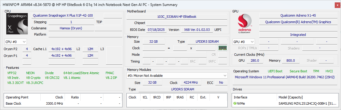 | HP EliteBook 6 G1q 14 Qualcomm Snapdragon X Plus X1P-42-100 ⎘ Qualcomm SD X Adreno X1-45 1.7 TFLOPS ⎘ 32 GB Geheugen, 512 GB SSD | Amazon: $1,382.03 Catalogusprijs: 1300 USD | 1.5 kg | 17 mm | 14.00" 1920x1200 162 PPI IPS | |