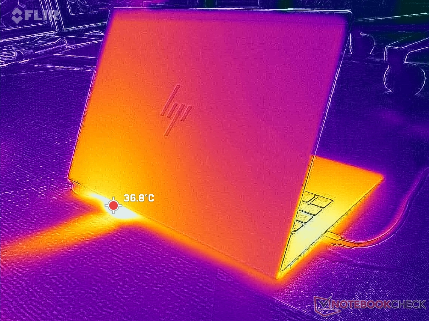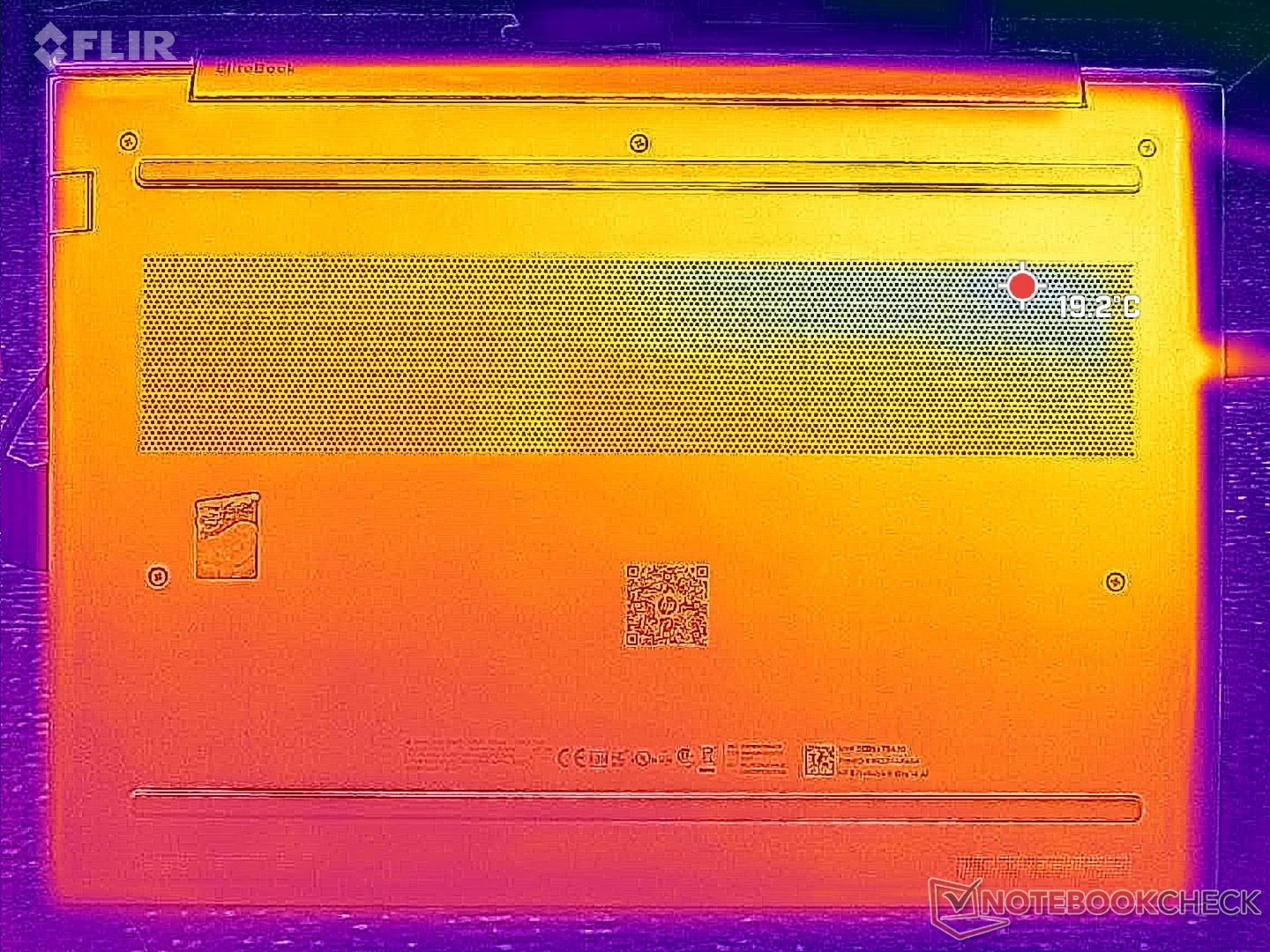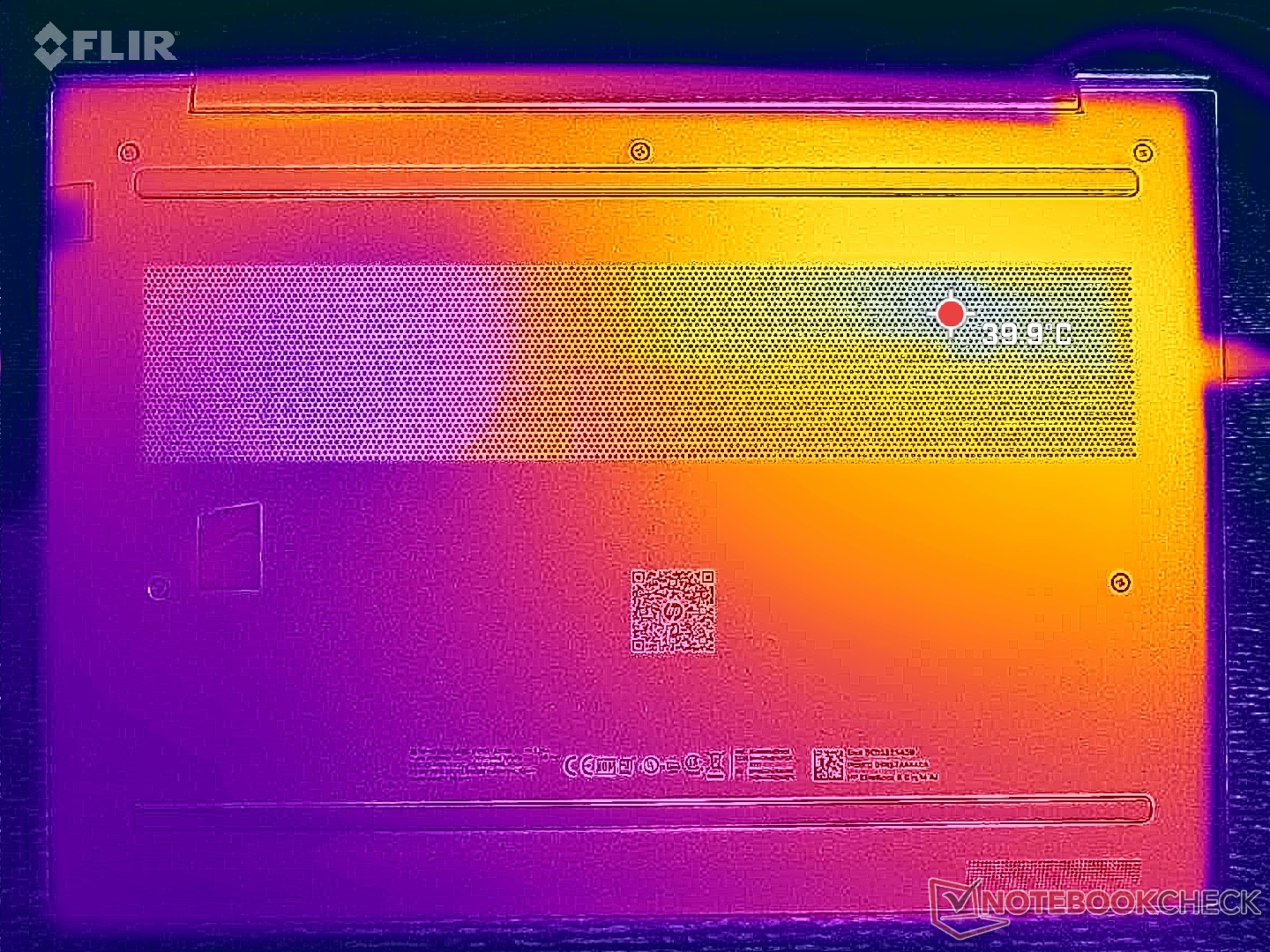 De oppervlaktetemperaturen zijn merkbaar warmer op de linkerhelft van het chassis, in de buurt van de processor. Hete plekken kunnen oplopen tot ongeveer 40 C, wat slechts iets koeler is dan wat we registreerden op de Intel-gevoede ThinkPad E14 Gen 7.