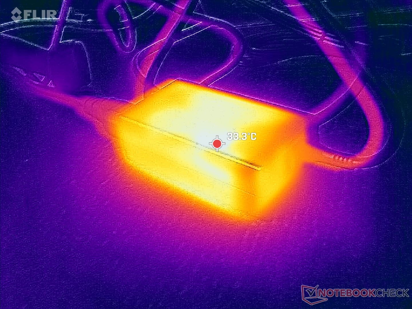 (+) Bij onbelast gebruik bedraagt de gemiddelde temperatuur voor de bovenzijde 22.5 °C / 73 F, vergeleken met het apparaatgemiddelde van 29.5 °C / 85 F.