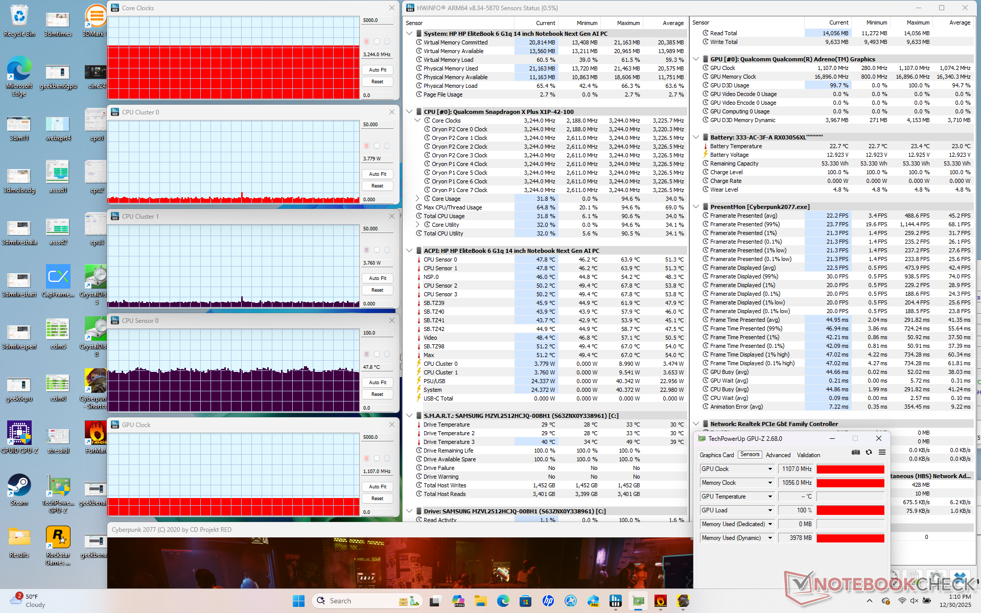 | Gemiddelde CPU-klok (GHz) | GPU-klok (MHz) | Gemiddelde CPU-temperatuur (°C) | |