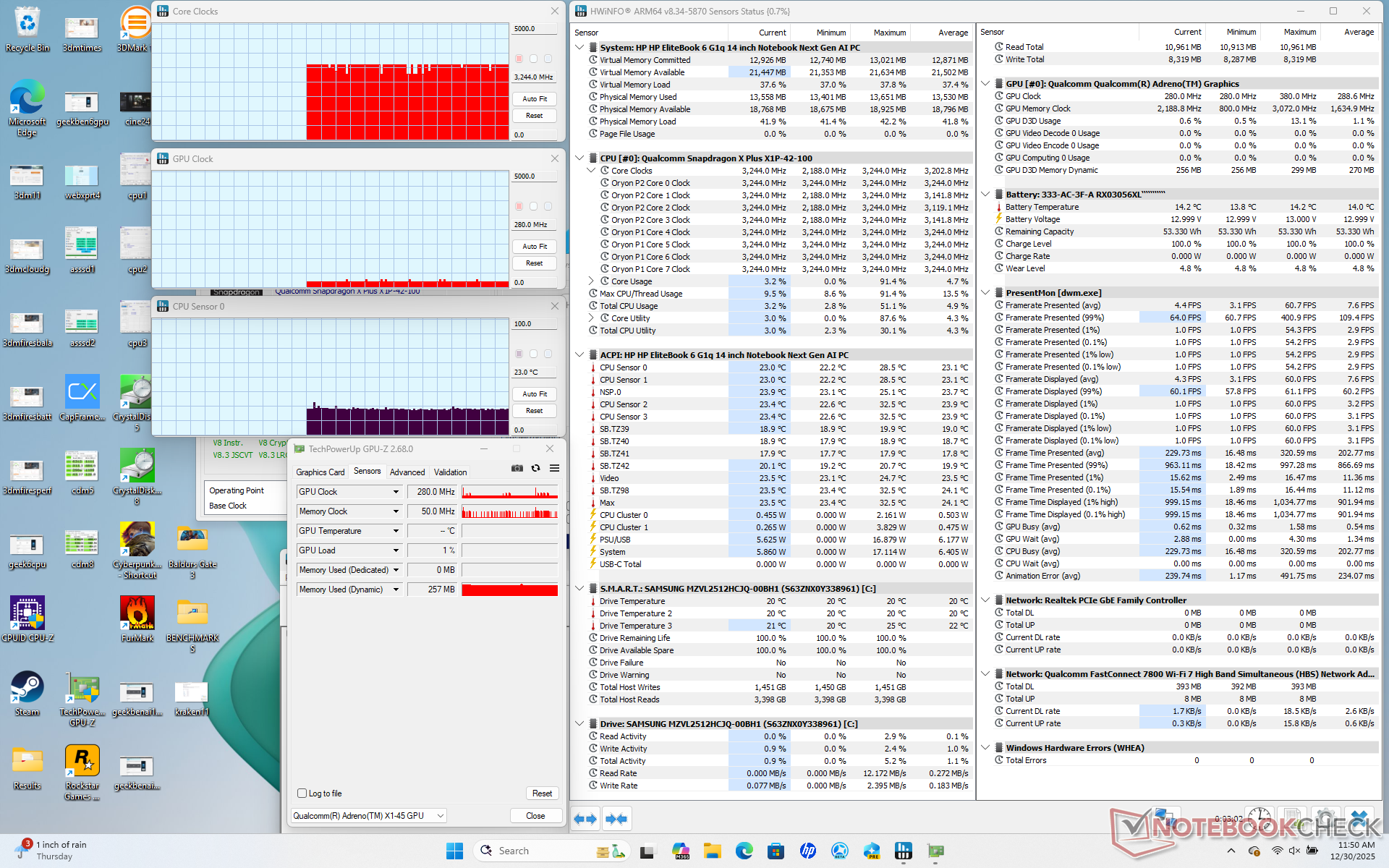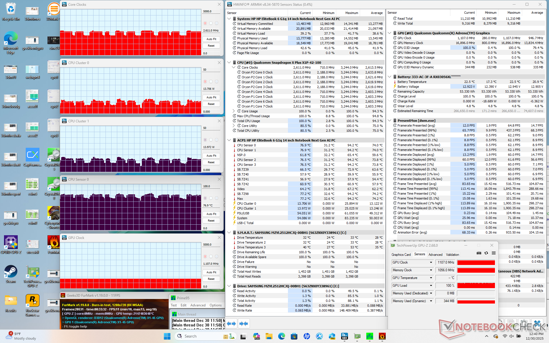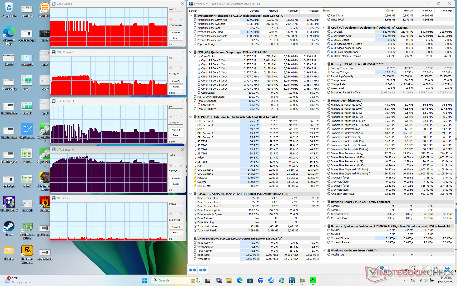 De Snapdragon-aangedreven EliteBook is naar verwachting zeer efficiënt, vooral bij het uitvoeren van gewone dagelijkse taken zoals browsers of video. Hij kan veeleisender zijn dan een Core Ultra 7 258V systeem zoals de ThinkPad T14 G6 wanneer de CPU volledig belast wordt, maar het biedt tegelijkertijd snellere prestaties voor een vergelijkbaar prestatieniveau per watt.