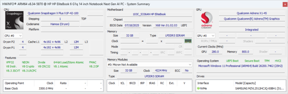 | HP EliteBook 6 G1q 14 Qualcomm Snapdragon X Plus X1P-42-100 ⎘ Qualcomm SD X Adreno X1-45 1.7 TFLOPS ⎘ 32 GB Geheugen, 512 GB SSD | Amazon: Catalogusprijs: 1300 USD | 1.5 kg | 17 mm | 14.00" 1920x1200 162 PPI IPS | |