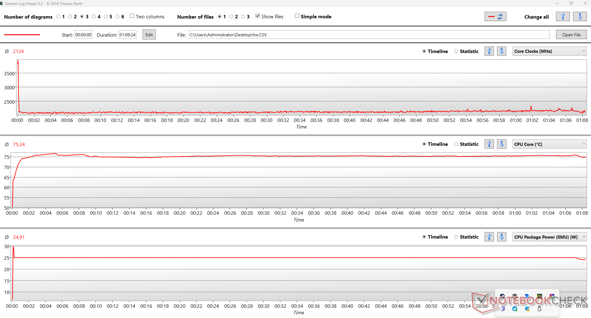 In onze gestandaardiseerde stresstest kwamen de CPU en GPU uit op respectievelijk een goede 2.100 en 600 MHz, en temperaturen van respectievelijk 75 en 72 °C.