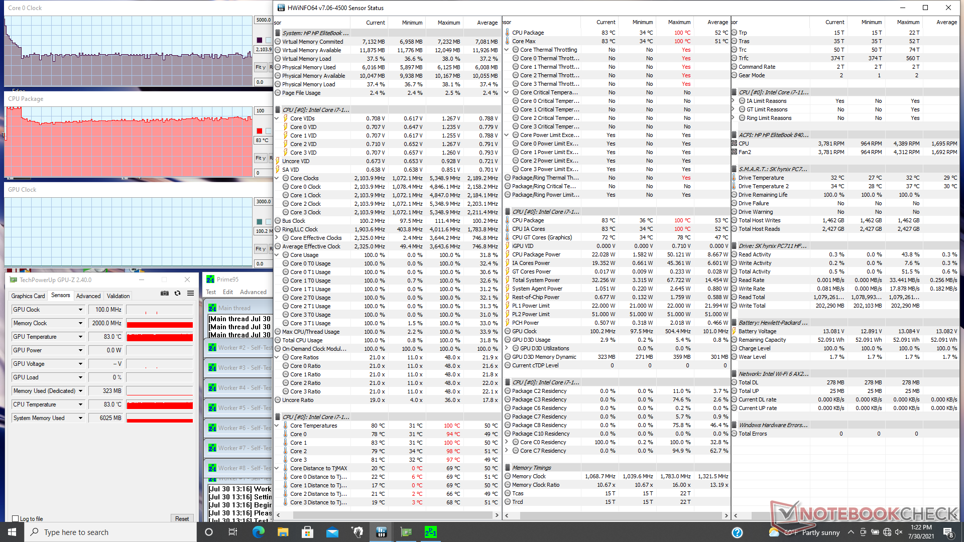 Wanneer de CPU wordt belast met Prime95, zal hij gedurende slechts een of twee seconden naar 4,3 GHz accelereren voordat hij een kerntemperatuur van 100 C bereikt. De kloksnelheid zal dan snel dalen tot een stabielere 2,1 GHz om een koelere kerntemperatuur van ongeveer 83 C te behouden MSI Summit E14 uitgerust met dezelfde Core i7 CPU zou resulteren in snellere kloksnelheden en warmere kerntemperaturen van respectievelijk 3,0 GHz en 91 C. Het is waarschijnlijk dat HP de prestaties had kunnen verbeteren door het geluidsplafond van de ventilator te verhogen.