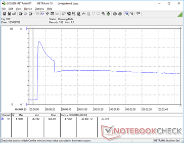 We zijn in staat om een maximaal verbruik van 66,5 W te meten van de kleine (~8,9 x 5,3 x 2,2 cm) 65 W AC adapter tijdens het draaien van Prime95. Deze snelheid is slechts tijdelijk, zoals blijkt uit de onderstaande grafiek, niet anders dan wat we waarnamen tijdens de Turbo Boost stresstest hierboven.
