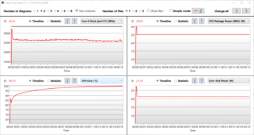 Het is opmerkelijk om te zien hoe langzaam de temperatuur stijgt. Meestal stijgen de temperaturen in de processor binnen enkele minuten, en zelfs bij lagere temperaturen zoals 80 of 90 °C (~176 of ~194 °F) worden ze onderschept door de klok te laten draaien. Op de een of andere manier lijkt het koelsysteem van het EliteBook erin te slagen de maximale APU-kloksnelheid dicht bij de limiet van thermische overbelasting te brengen. 2.6 GHz ligt binnen het Turbo-bereik, en na een prestatiepiek in de eerste paar seconden (30 watt, >3.0 GHz) werkt het CPU-pakket constant op 25 watt.