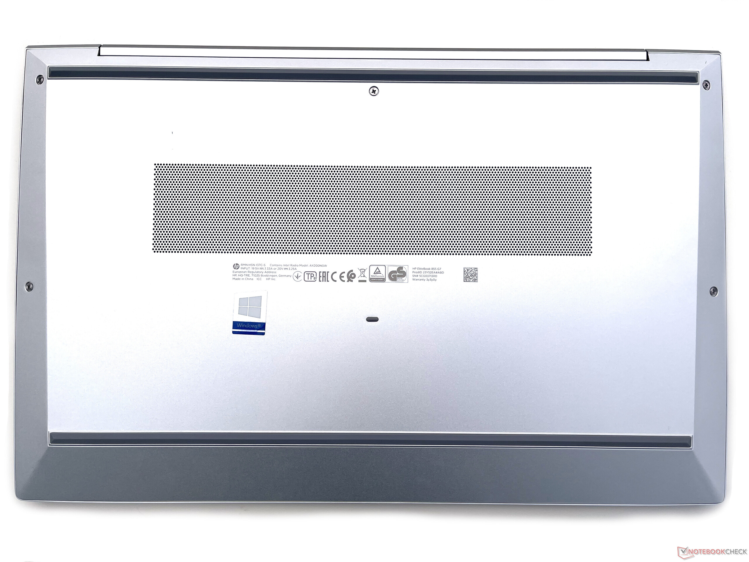 De behuizing is volledig van metaal en maakt een goede eerste indruk. De materiaalkeuze komt ook de haptiek en de stabiliteit van de behuizing ten goede. De basiseenheid van de laptop is zeer moeilijk te verdraaien en ook het deksel ziet er robuust uit. De scharnieren zijn ook stevig en houden het display in alle openingshoeken goed vast. Het hoekdesign en bepaalde optische accenten, zoals het patroon in de volumeperforatie of de lichtgrijze EliteBook-belettering, laten zien dat dit geenszins een budget-notebook is. Er zijn dus geen materiële uitsteeksels of ongelijke spleetafmetingen. De voorkant is niet vlak, maar iets schuin om het openen van de laptop te vergemakkelijken. Het scharnier is echter te stijf of het basisstation is te licht om de laptop met één hand te openen