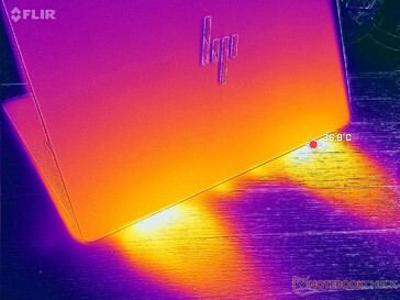 De oppervlaktetemperaturen zijn het warmst in het midden, waar hete plekken 36 C kunnen bereiken bij zware belastingen. Dit is merkbaar koeler dan op de uitgaande EliteBook 1040 G10 met bijna 10 C onder vergelijkbare omstandigheden, ondanks de grote prestatieverschillen.