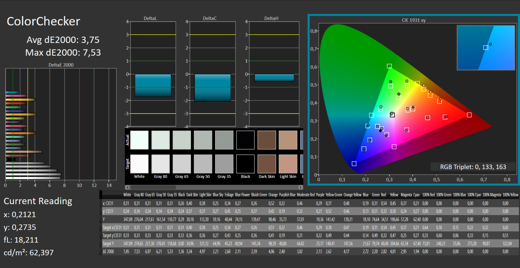 | Colorchecker dE 2000 * | 3.75 | 2.82 25% | 4.3 -15% | 2.4 36% |