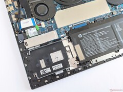 Nadat je de klemmen eindelijk hebt kunnen losmaken, krijg je echter toegang tot de SSD, de twee RAM-sleuven, de WLAN-module, een sleuf voor een 2,5-inch schijf, en de ingeschroefde batterij.
