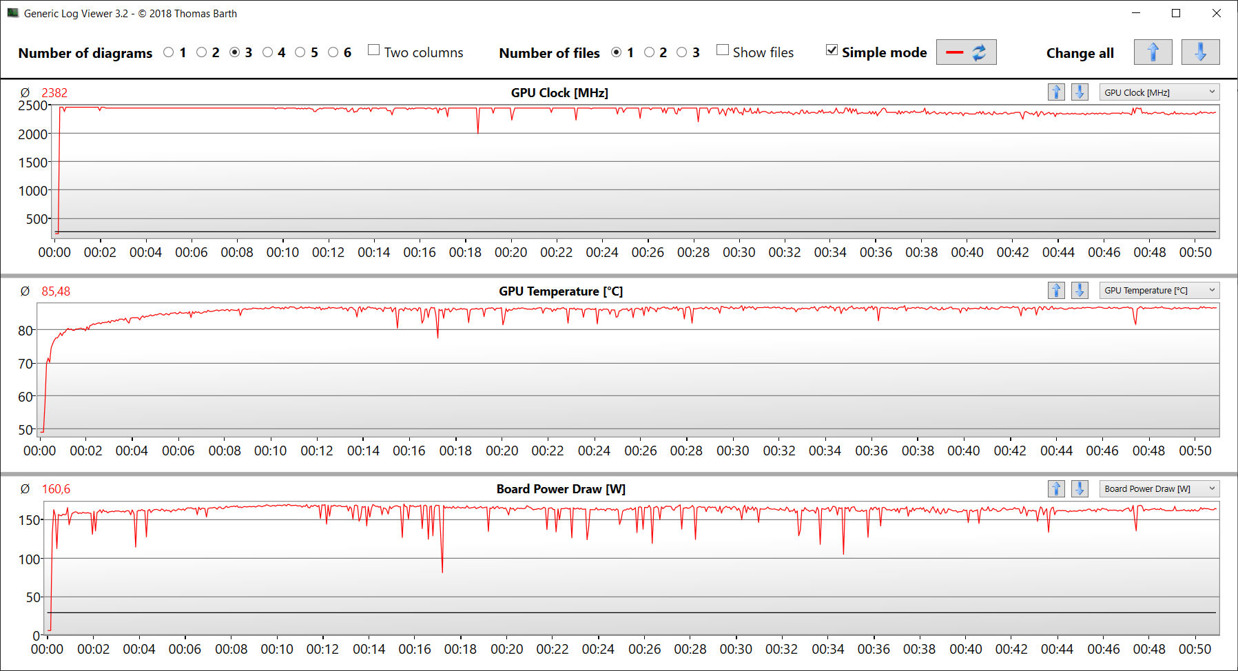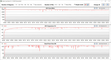 De logbestanden geven een indicatie van het probleem: tijdens de low-load runtime tests (WiFi, idle, video) zou de GeForce GPU inactief moeten zijn en al het werk aan de iGPU moeten overlaten. De GeForce GPU draait hier echter vaak op maximale snelheid - bij een belasting van 0%. Volgens GPU-Z leidt dit tot een stroomverbruik van maximaal 45 watt.