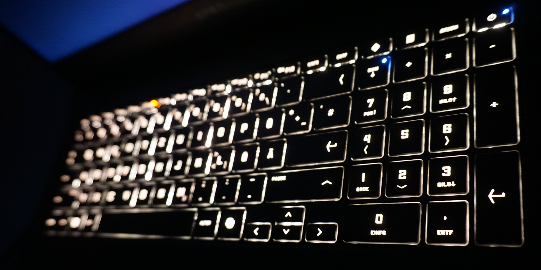 Het toetsenbord ziet er niet helemaal passend uit voor een gaming-laptop. De toetsaanslag is kort en de toetsweerstand is nauwelijks merkbaar. Daarnaast mist het toetsenbord de individueel instelbare verlichting. Hoewel u bijna elke kleur kunt selecteren met fijne aanpassingen van de helderheid, worden alle toetsen vervolgens in dezelfde kleur verlicht. Op zijn minst hadden de pijltjestoetsen op ware grootte moeten zijn.