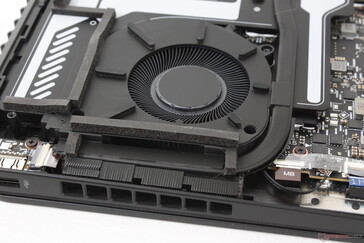 Het bodempaneel kan gemakkelijk worden verwijderd met een gewone kruiskopschroevendraaier. De twee M.2 2280 SSD-sleuven en twee SODIMM-sleuven zijn duidelijk gelabeld voor upgrades door eindgebruikers. De WLAN-module is technisch gezien ook verwijderbaar, maar deze zit verstopt onder de koeloplossing en is daarom moeilijker te verwijderen.