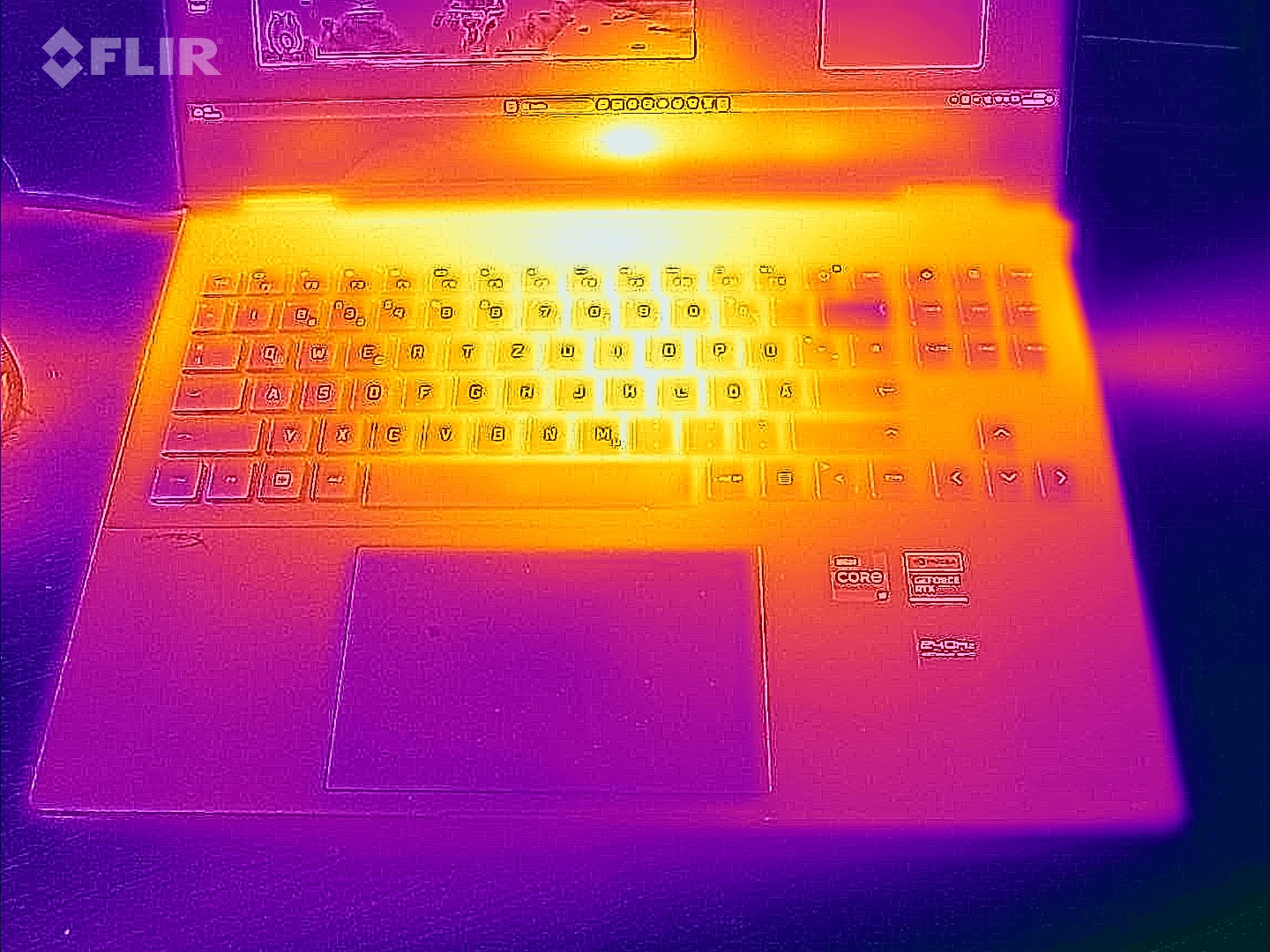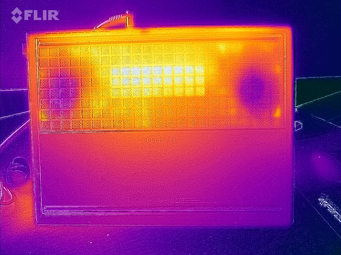 Terwijl de temperaturen aan de bovenkant van de laptop in de middenmoot liggen, wordt de onderkant van de behuizing onder belasting warmer dan de concurrentie. Een maximum van 63 °C (tijdens het gamen) zal gebruikers ervan weerhouden het apparaat op schoot te gebruiken. In rusttoestand is de situatie aanzienlijk comfortabeler, waarbij het chassis aangenaam koel blijft bij een maximum van 30 °C.