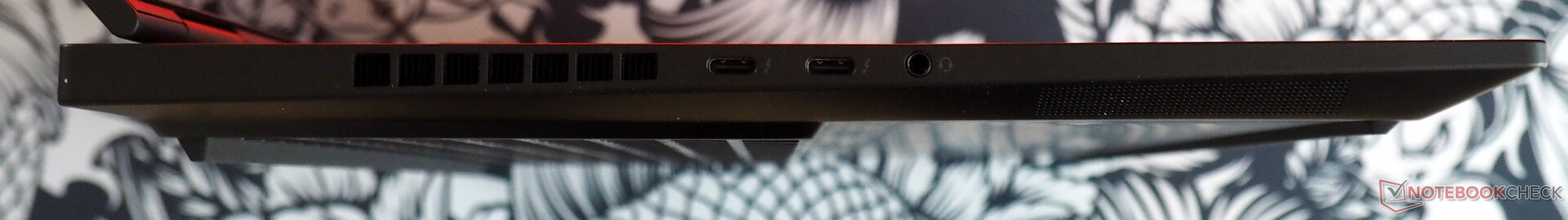 De poortkeuze kan als zeer modern worden omschreven. Terwijl de achterkant een RJ45-poort (helaas geen 2,5 Gbit LAN), een HDMI 2.1-uitgang en een USB 3.0-poort (type A) bevat, zijn aan de linkerkant twee Thunderbolt 4-poorten (inclusief Power Delivery) en een audio-aansluiting te vinden. Aan de rechterkant is er slechts één eenzame USB 3.0-poort (type A). Kopers moeten het stellen zonder een Kensington-slot en een kaartlezer.