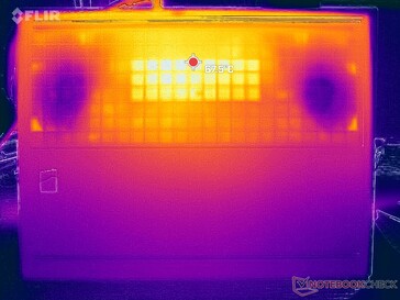 De oppervlaktetemperaturen zijn het warmst in het midden door de symmetrische koeloplossing binnenin. Het midden van het toetsenbord kan tijdens het gamen 40 tot 45 C bereiken en de onderkant kan nog warmer zijn. Dit bereik is echter nog steeds vergelijkbaar met deLegion Slim 7i 16 G8. De rest van de laptop is koeler, inclusief de palmsteunen, WASD-toetsen en pijltjestoetsen waar de huid vaker in contact komt tijdens het gamen.