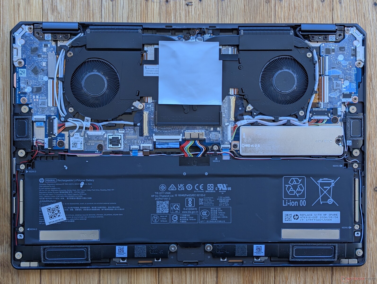 Het chassis bestaat voornamelijk uit een gladde aluminiumlegering voor een vergelijkbare eerste indruk als de OmniBook Ultra clamshell of Spectre x360 14. Het heeft zelfs de "diamantgeslepen" achterhoeken zoals op het laatstgenoemde ontwerp.