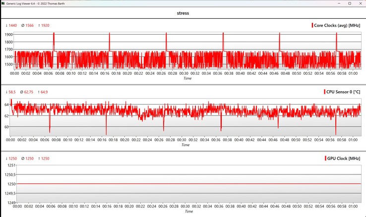 Onder belasting meten we kort een maximum van iets minder dan 68 W, dat vervolgens afvlakt tot ongeveer 35 W tijdens de stresstest. De meegeleverde 65 W voeding is dus voldoende voorzien, en de batterij wordt niet eens aangesproken aan het begin van de stresstest. Het stand-byverbruik ligt met 0,8 W iets hoger.
