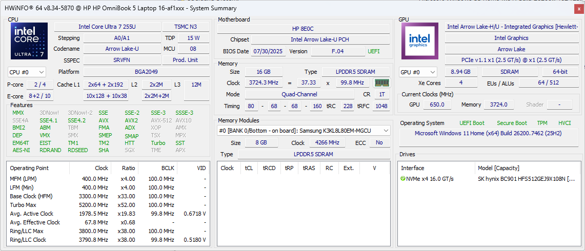 | HP Omnibook 5 16-af1037nr Intel Core Ultra 7 255U ⎘ Intel Graphics 4-Core iGPU (Arrow Lake) ⎘ 16 GB Geheugen | Amazon: $652.00 Catalogusprijs: 660 USD | 1.7 kg | 18.6 mm | 16.00" 1920x1200 142 PPI IPS | |