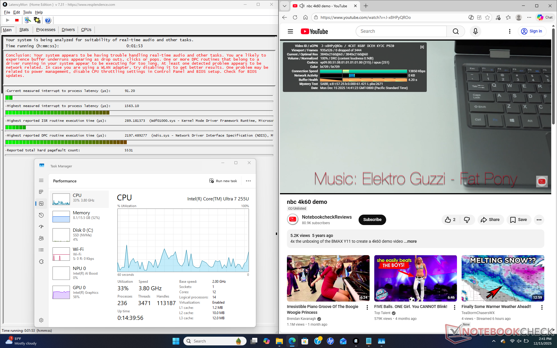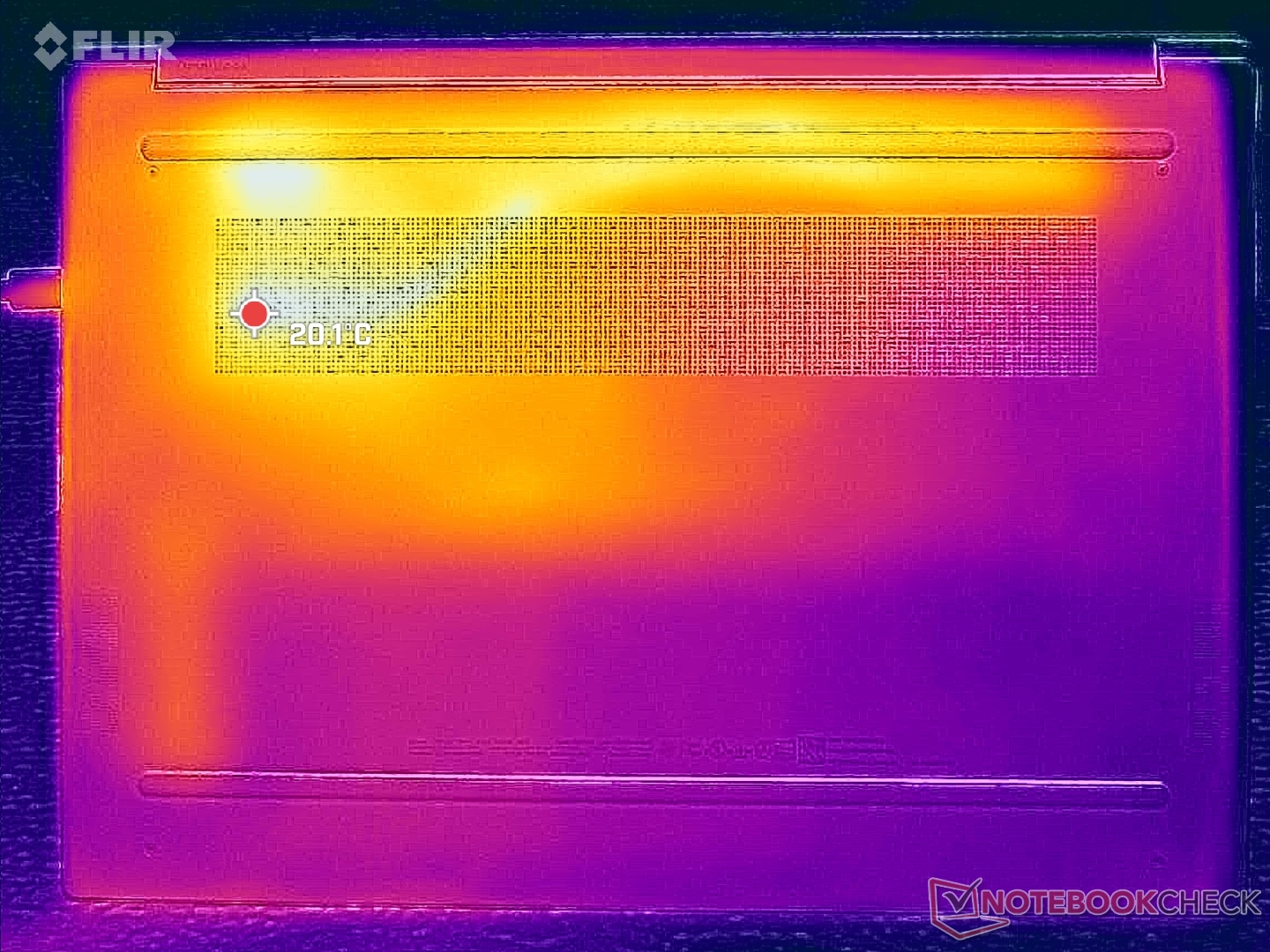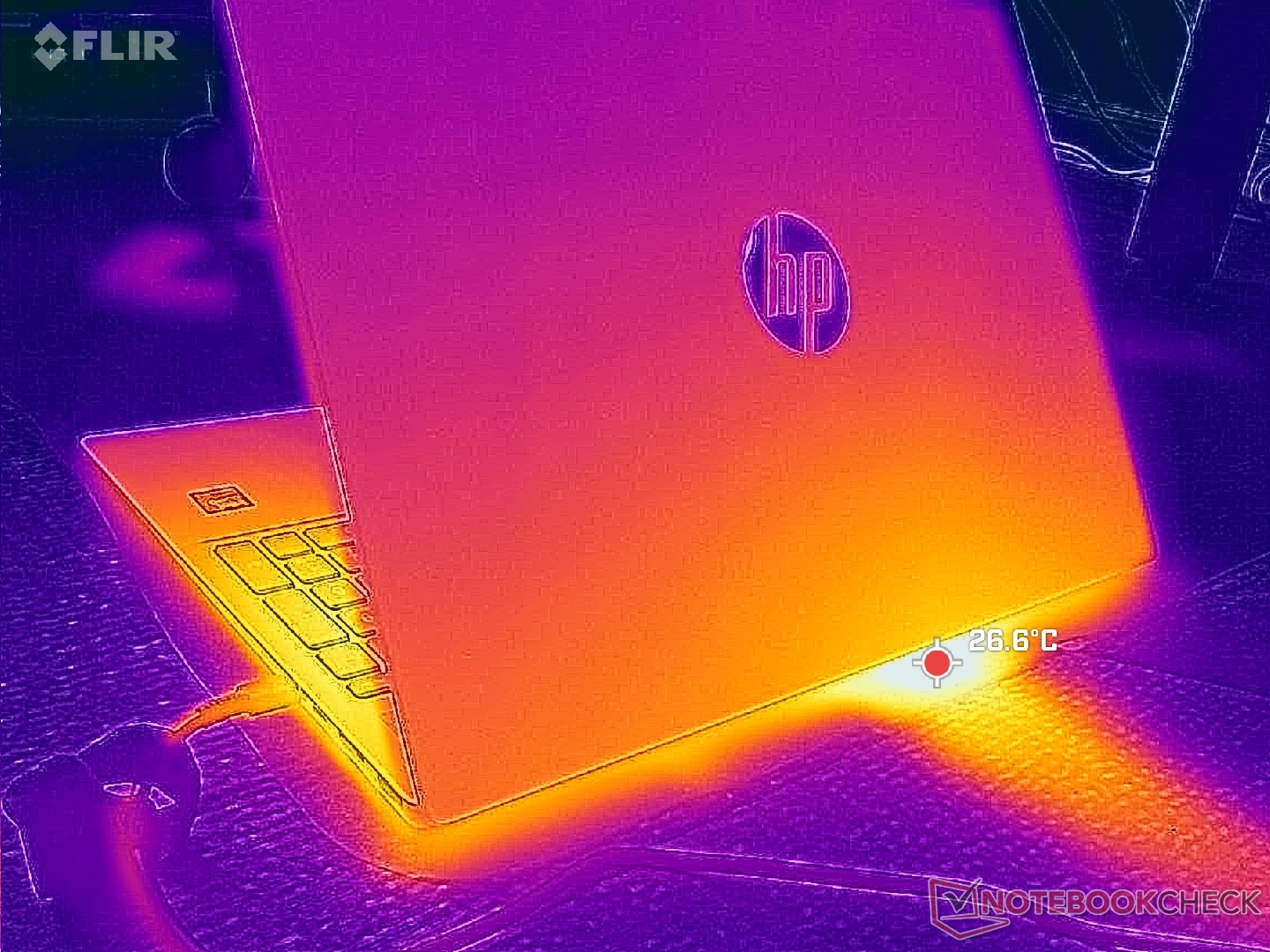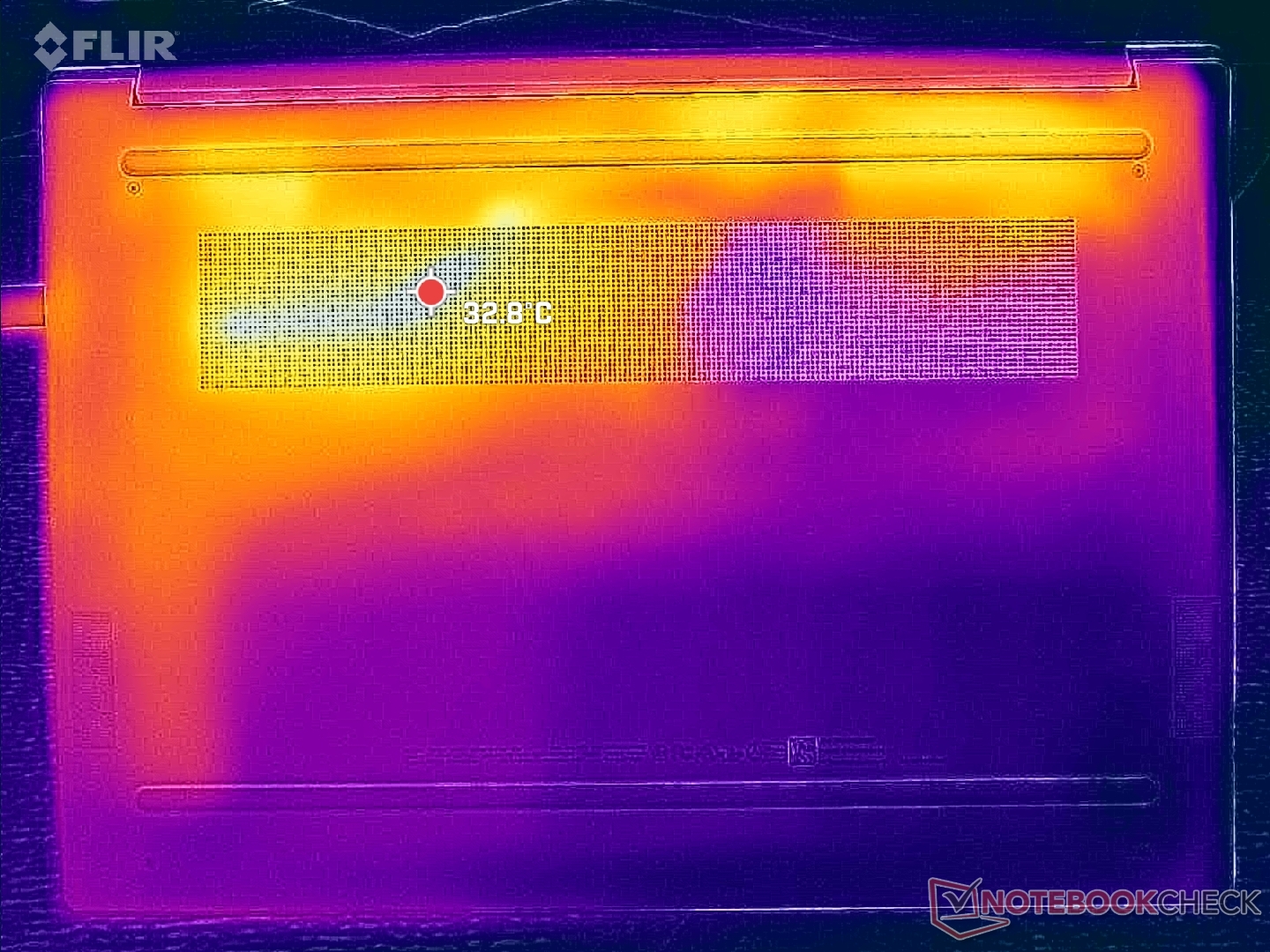 De rechterhelft van het chassis wordt merkbaar warmer dan de linkerhelft door de koeloplossing binnenin. Hete plekken worden echter nooit oncomfortabel, omdat de CPU uit de Core U-serie in eerste instantie niet erg veeleisend is.