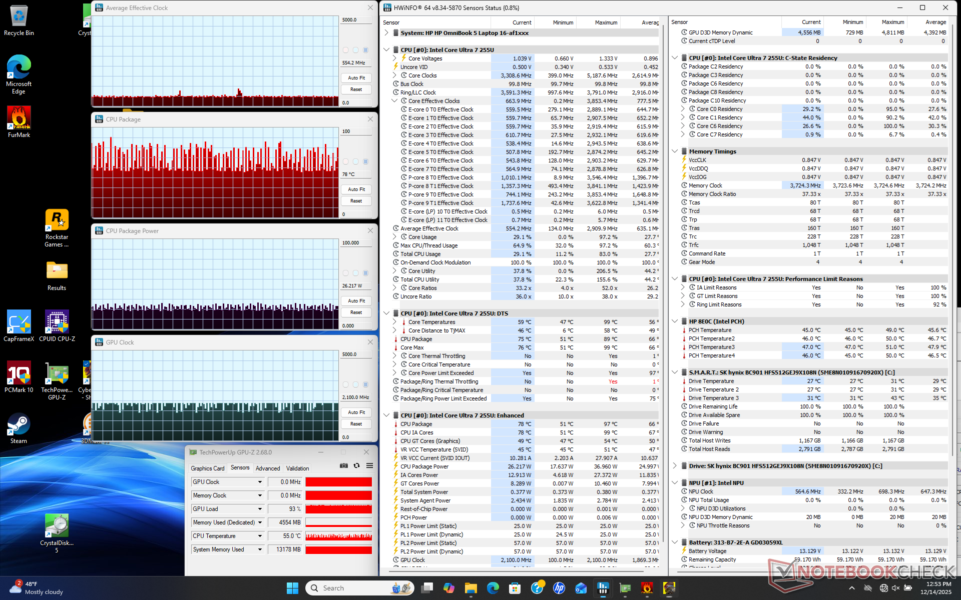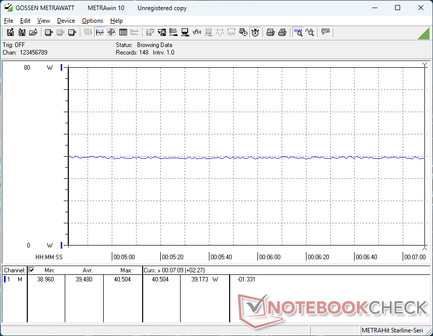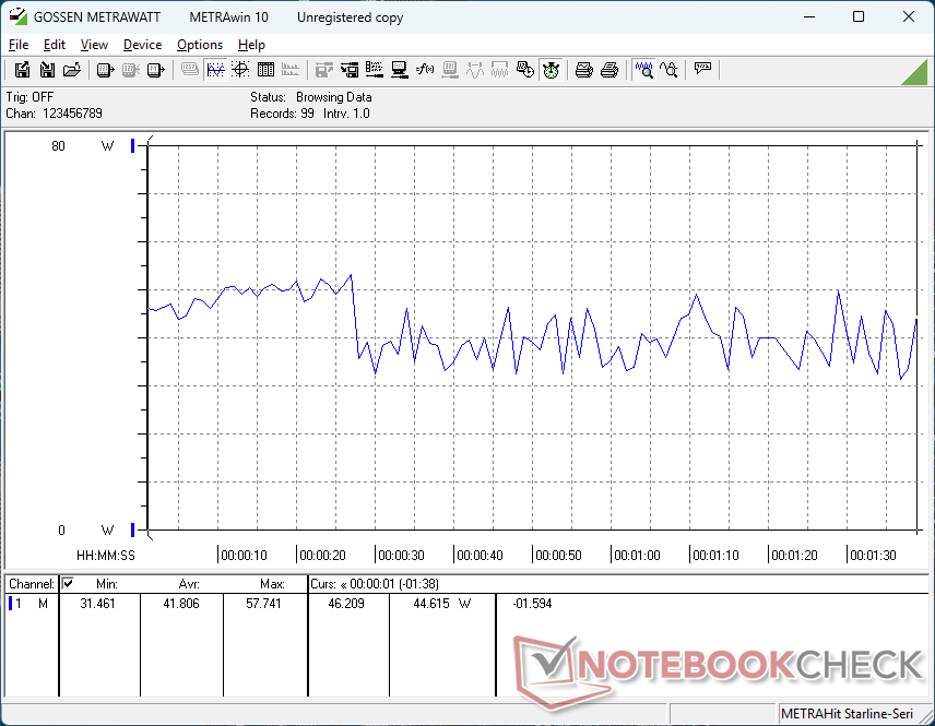 Het totale verbruik ligt in de buurt van wat we registreerden op de Lunar Lake V-powered Dell 16 Plus met vergelijkbare CPU-prestaties, maar aanzienlijk langzamere grafische prestaties. De kleine 65 W USB-C AC-adapter is voldoende voor het prestatieniveau en de stroomvraag.