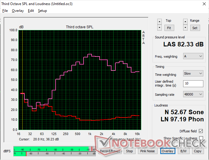 (+) | de hoge tonen zijn lineair (2.7% delta naar de vorige frequentie)