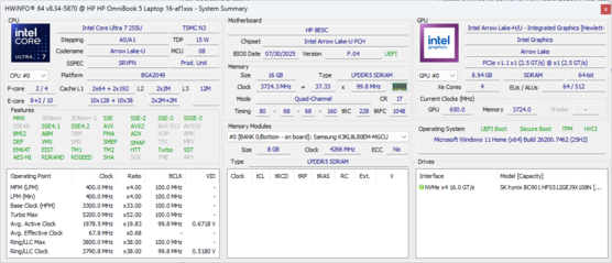 | HP Omnibook 5 16-af1037nr Intel Core Ultra 7 255U ⎘ Intel Graphics 4-Core iGPU (Meteor / Arrow Lake) ⎘ 16 GB Geheugen | Amazon: $1,225.00 Catalogusprijs: 660 USD | 1.7 kg | 18.6 mm | 16.00" 1920x1200 142 PPI IPS | |