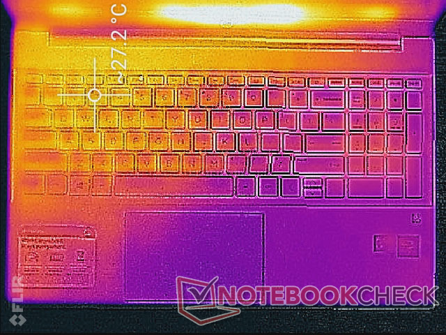 De oppervlaktetemperaturen zullen altijd warmer zijn op de linkerhelft van het systeem dan op de rechterhelft, eenvoudigweg vanwege de manier waarop de ventilatoren en de heat pipes binnenin zijn geplaatst. Hete plekken kunnen worden zo warm als 44 C en 54 C op het toetsenbord dek en de bodem oppervlak, respectievelijk, om een beetje warmer dan wat we geregistreerd op de Pavilion 15 Gaming of ADATA XPG Xenia. De totale warmteafgifte is over het algemeen hoger dan bij de meeste laptops die alleen op Tiger Lake-U CPU's draaien, omdat onze Pavilion discrete graphics bevat.