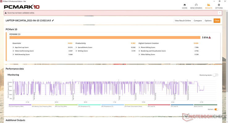 Stationair draaien op de desktop bij de laagste helderheidsinstelling verbruikt slechts 4,9 W, terwijl de maximale helderheidsinstelling ongeveer 3 W meer vraagt. Het inschakelen van de discrete Nvidia GPU via Optimus zou het systeemverbruik verhogen tot 14 W, wat enkele watts meer is dan andere Tiger Lake-U laptops zonder dezelfde GPU optie. Het wordt aanbevolen om de geïntegreerde Intel GPU te gebruiken als de extra paardenkracht van de MX450 niet nodig is.