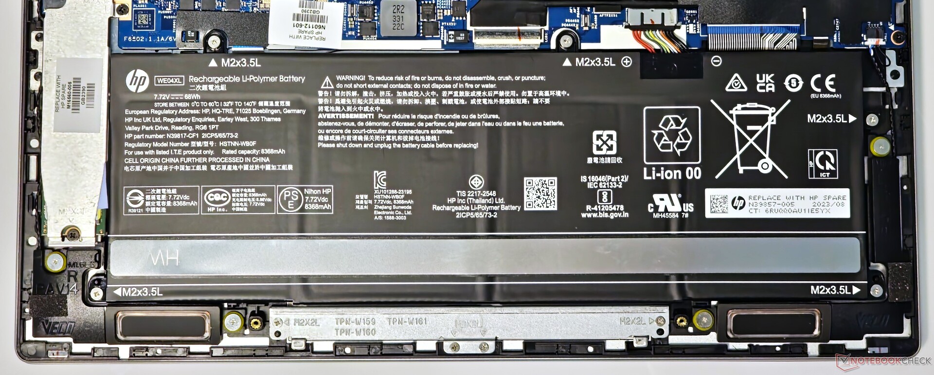 De Pavilion Plus 14 Core i7 verbruikt minimale energie in ruststand, wat hem een aanzienlijk voordeel geeft ten opzichte van de Asus ExpertBook B9. De meegeleverde 65 W voedingsadapter is voldoende om de laptop onder belasting van stroom te voorzien.