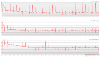 De geïntegreerde Iris Xe Graphics kan tijdelijk 20,3 W gebruiken en een boost geven tot 1.300 MHz na het toevoegen van FurMark, maar kan in totaal niet meer dan 4 W gebruiken. De iGPU kan echter 9,23 W gebruiken en een boost geven tot 1.177 MHz gemiddeld tijdens belasting met The Witcher 3 op 1080p Ultra.