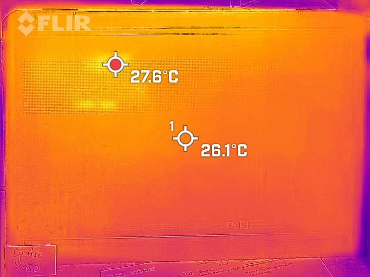 De kasttemperaturen blijven binnen de groene zone bij dagelijks gebruik (kantoor, internet). De notebook warmt nauwelijks op onder belasting (stresstest, Witcher 3 test): de temperaturen blijven op alle meetpunten onder de 40 graden Celsius.