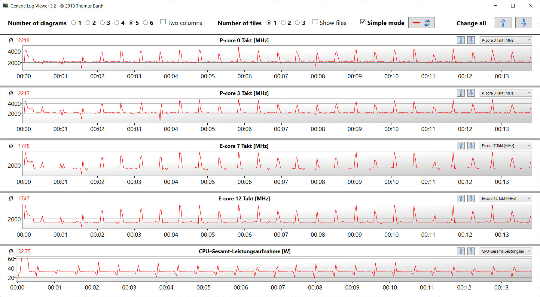 De stresstest (Prime95 en Furmark in permanent bedrijf) vormt een extreem scenario om de stabiliteit van het systeem onder volledige belasting te controleren. De CPU begint de test op lage tot gemiddelde kloksnelheid (P-kernen: ongeveer 2,4 tot 2,6 GHz; E-kernen: ongeveer 1,9 tot 2,3 GHz). De GPU gaat op vol vermogen (1.400 MHz). De waarden dalen naarmate de test vordert.