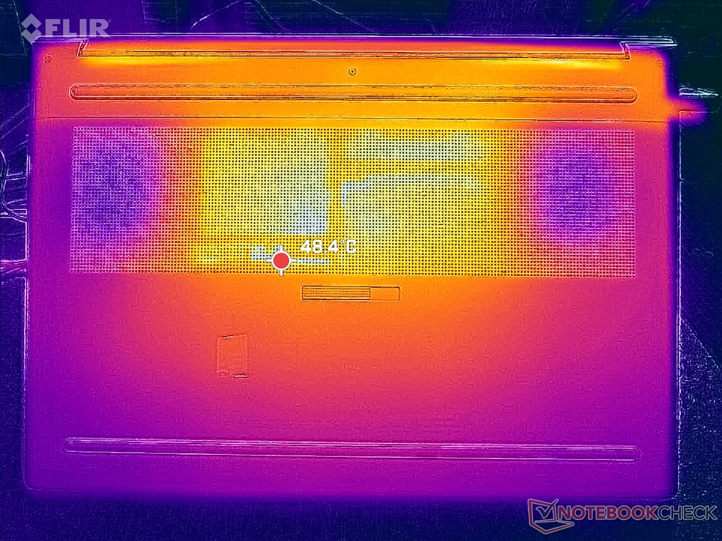 De oppervlaktetemperaturen kunnen oplopen tot meer dan 36 C in het midden van het toetsenbord of 45 C aan de achterkant bij hoge belastingen. Interessant genoeg is het systeem koeler dan de Precision 5680 op het toetsenbord, maar het tegenovergestelde geldt voor de onderoppervlakken.