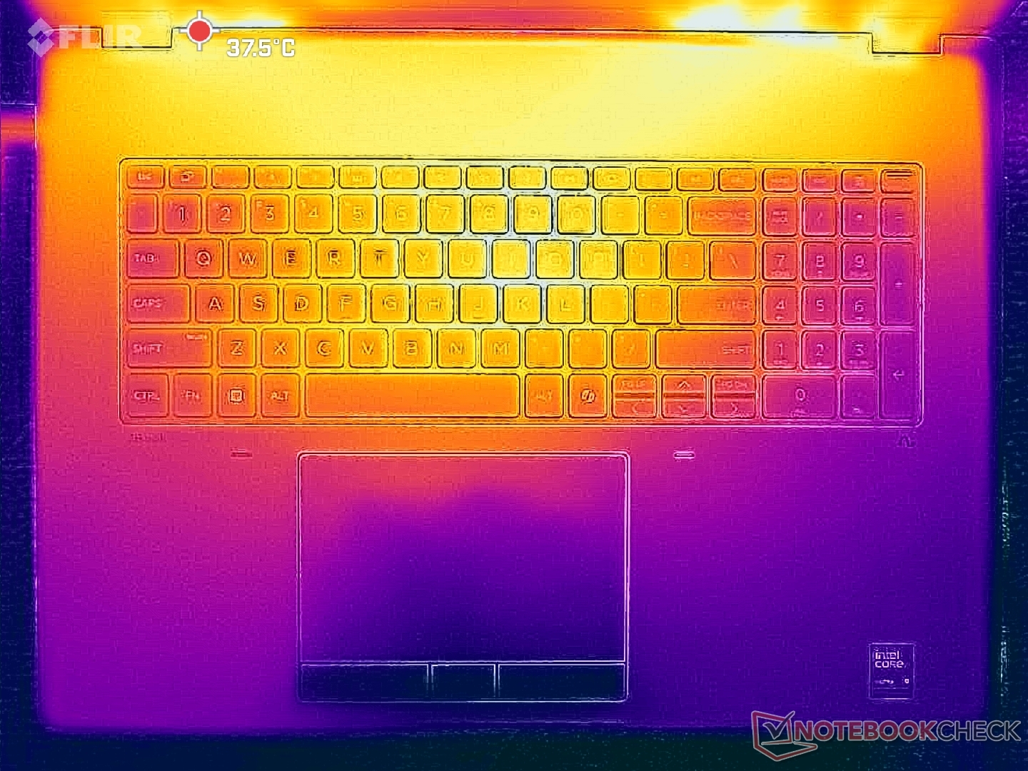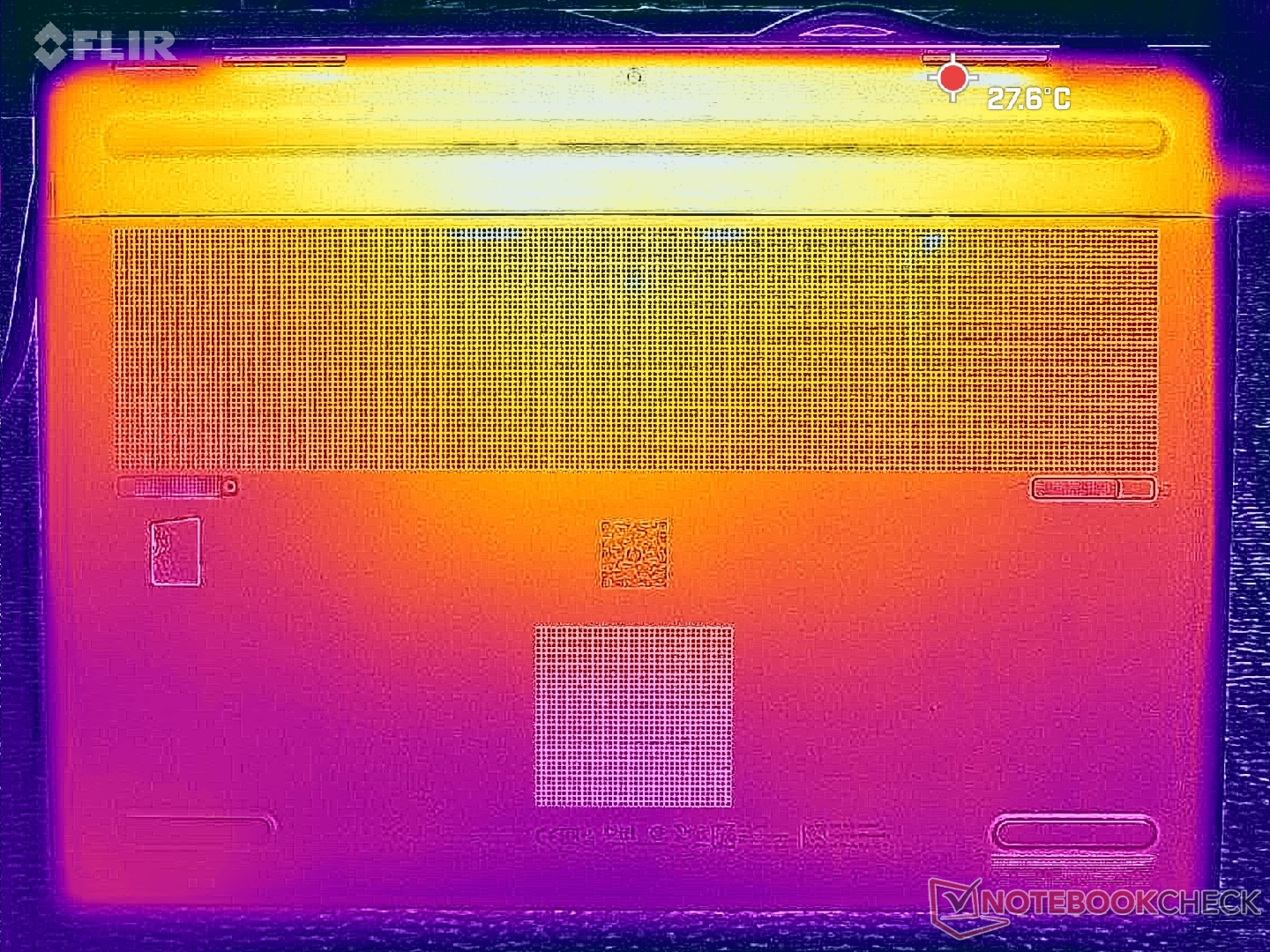 De oppervlaktetemperaturen blijven redelijk koel, zelfs bij zware belastingen. Hete plekken op het toetsenbord en de onderklep kunnen oplopen tot respectievelijk 40 C en 36 C, vergeleken met bijna 50 C op de Schenker Key 18 Pro.