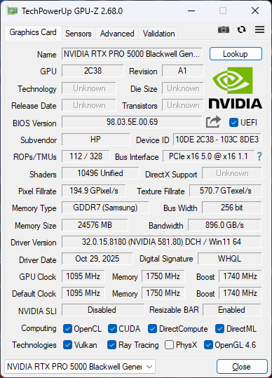 | HP ZBook Fury G1i 18 Ultra 9 285HX, RTX PRO 5000 Blackwell Generation Laptop, , IPS, 2560x1600, 18" | Dell Pro Max 18 Plus MB18250 Ultra 9 285HX, RTX PRO 5000 Blackwell Generation Laptop, , IPS, 2560x1600, 18" | Schenker Key 18 Pro M25 RTX 5090 Ultra 9 275HX, GeForce RTX 5090 Laptop, Samsung 9100 Pro 4 TB, IPS, 3840x2400, 18" | Lenovo ThinkPad P16 Gen 2 i7-14700HX, RTX 4000 Ada Generation Laptop, SK hynix PC801 HFS001TEJ9X162N, IPS, 2560x1600, 16" | HP ZBook X G1i 16 Ultra 7 265H, RTX PRO 2000 Blackwell Generation Laptop, Samsung PM9A1 MZVL22T0HBLB, IPS, 2560x1600, 16" | HP ZBook Studio 16 G11 Ultra 9 185H, RTX 3000 Ada Generation Laptop, Kioxia XG8 KXG80ZNV1T02, IPS, 3840x2400, 16" | |