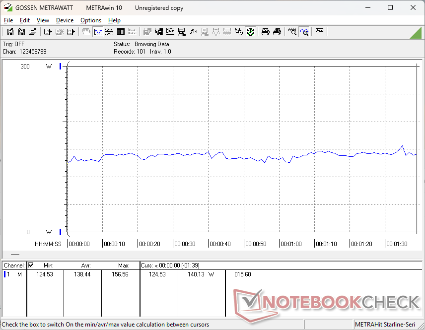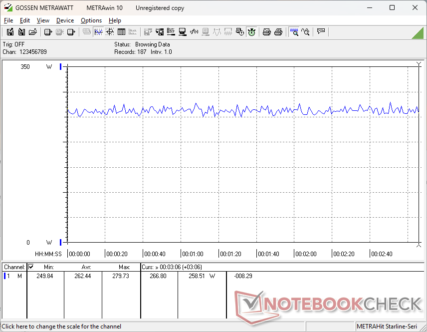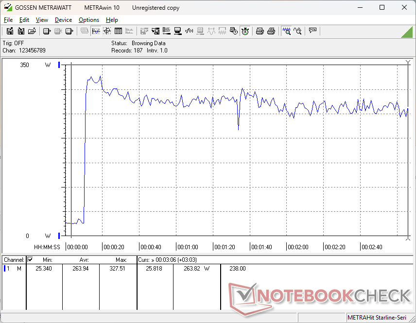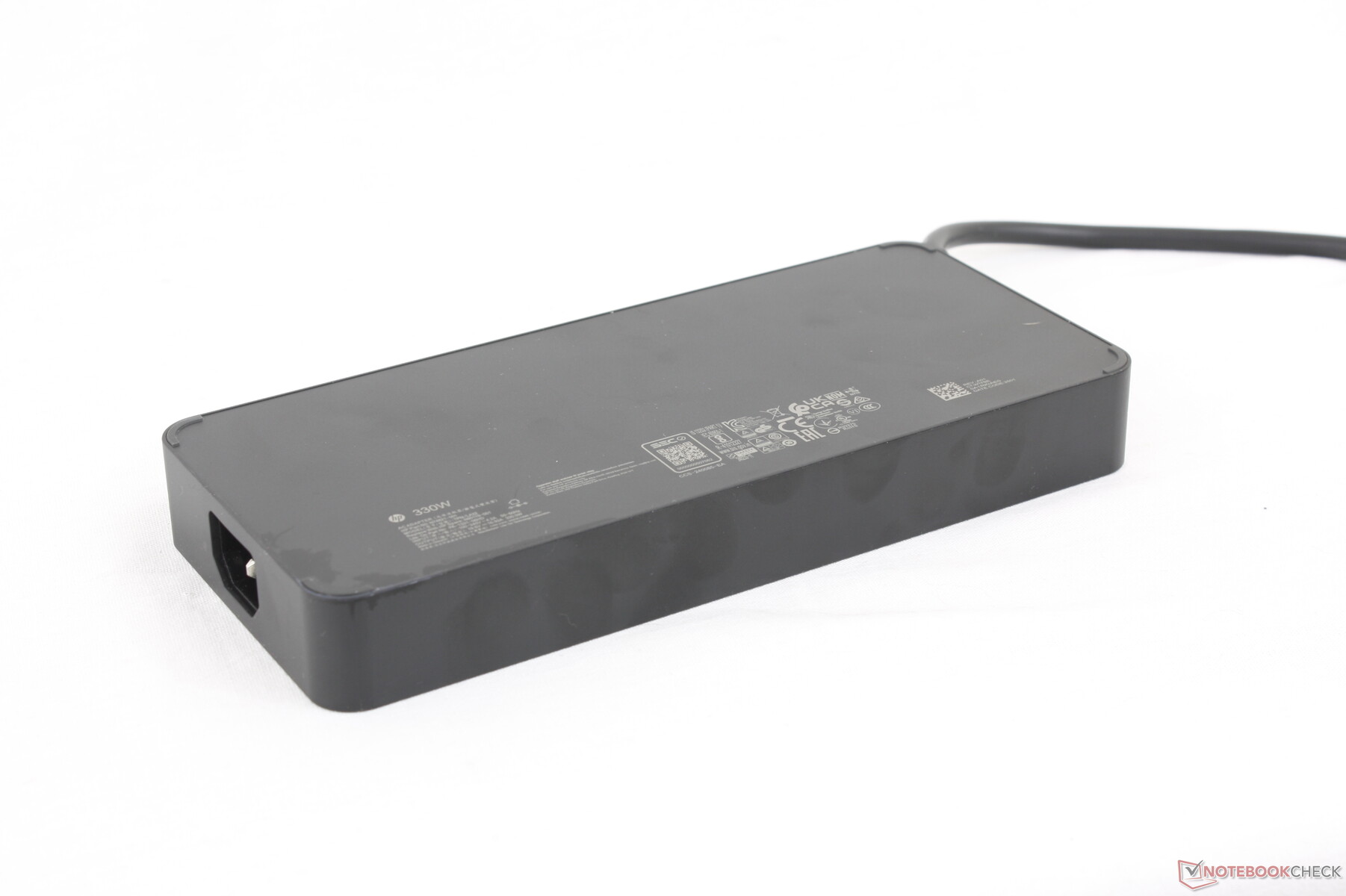 De HP wordt geleverd met een 330 W wisselstroomadapter, terwijl de Dell wordt geleverd met een 280 W USB-C wisselstroomadapter. Het maximale verbruik is daarom hoger op de HP, waar het in onze tests kan oplopen tot 328 W in vergelijking met 281 W op de Dell, maar dit hoge verbruik is van korte duur vanwege thermische beperkingen of opgelegde plafonds. Bij het gelijktijdig uitvoeren van Prime95 en FurMark, bijvoorbeeld, piekte het verbruik op 328 W voordat het zich snel stabiliseerde rond 265 W, vergelijkbaar met wat we waarnamen op de Dell. Voor prestatiedoeleinden maakt de grotere 330 W wisselstroomadapter dus weinig uit.